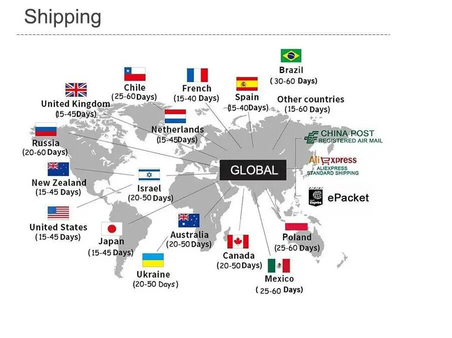 Packages from our warehouse in China will be shipped by ePacket or EMS depending on the weight and size of the product. Packages shipped from our US warehouse are shipped through USPS.