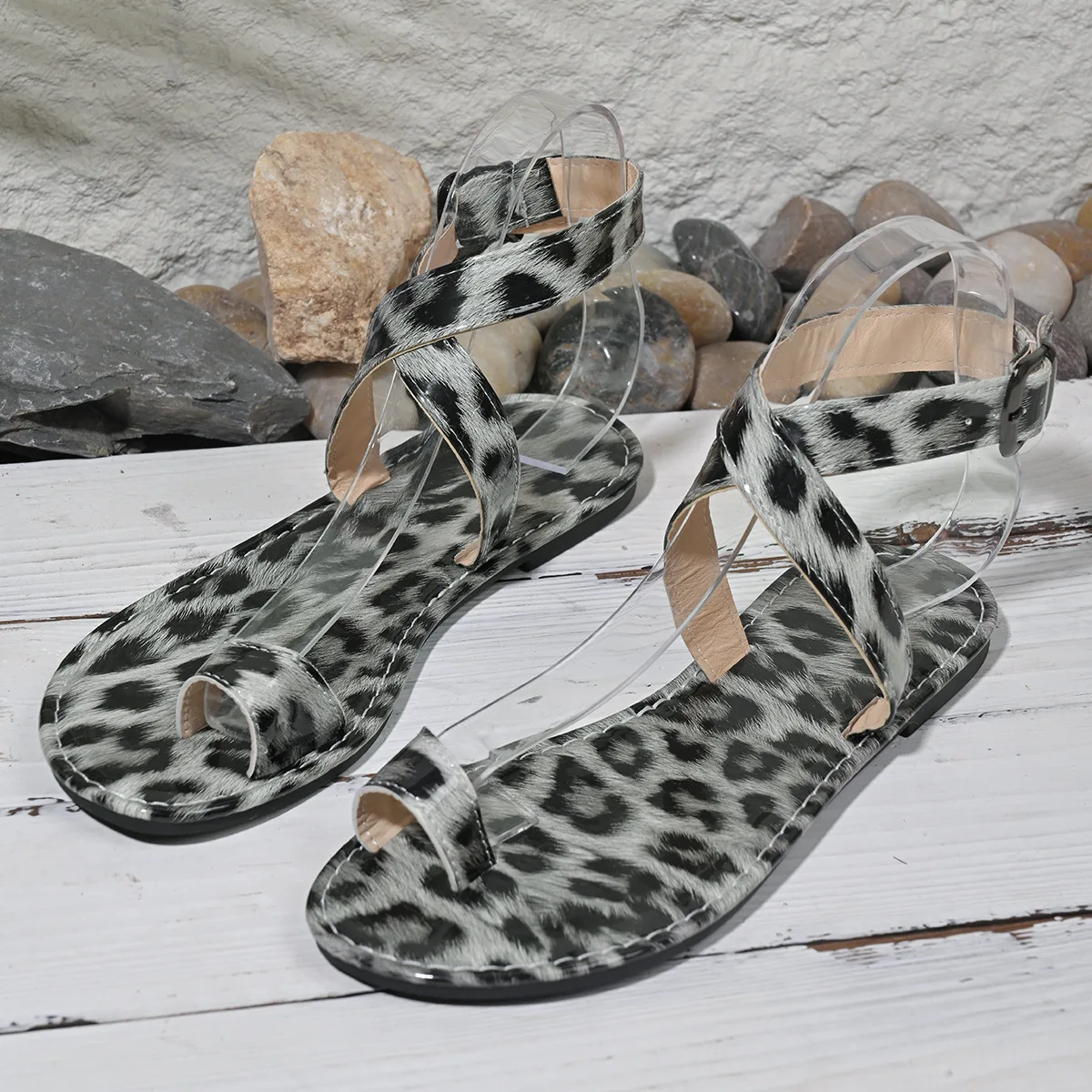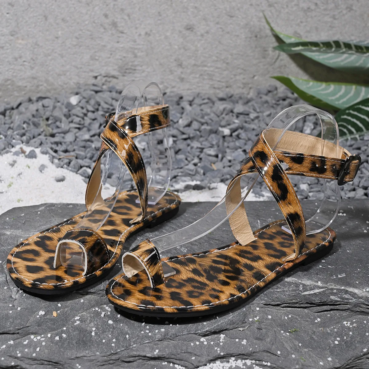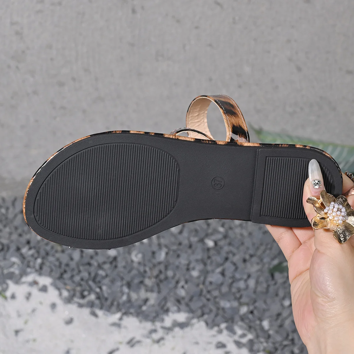 Summer Sandals Leopard Print Flat-bottomed Clip Toe Sandals One-word Buckle Belt Fashionable Outdoor Large Size Women’s Shoes