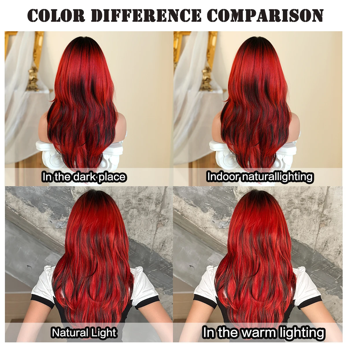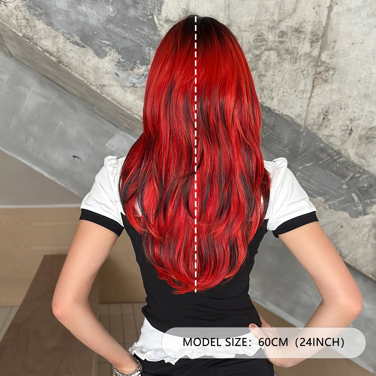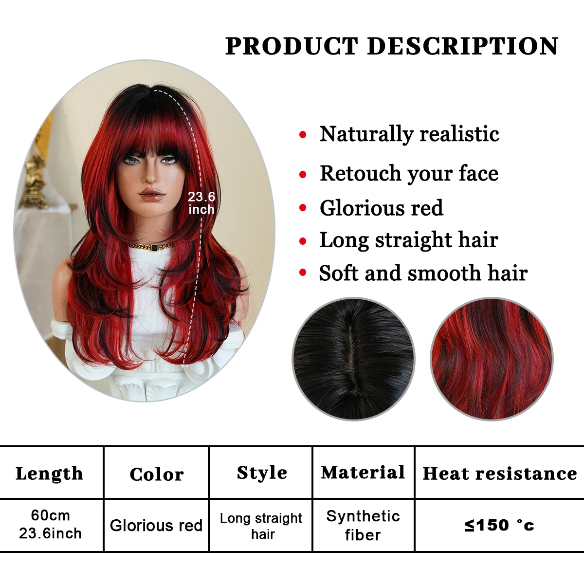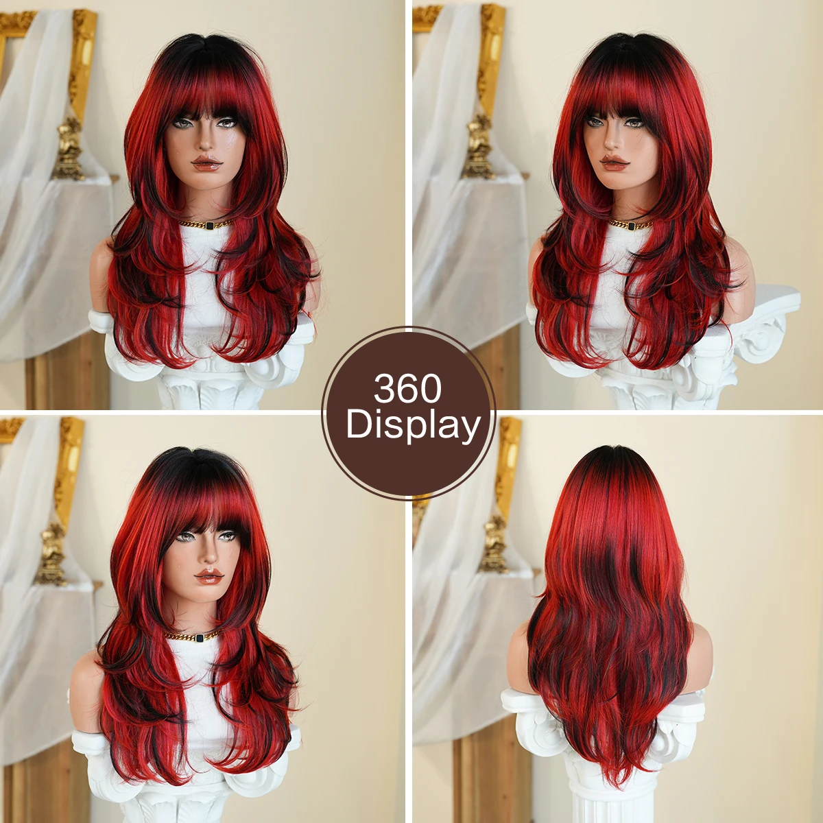 Synthetic Long Wave Red Wigs For Women With Bangs Natural Dark Roots High Quality Heat Resistant Fiber Wig Hair Tail Dyed Black
