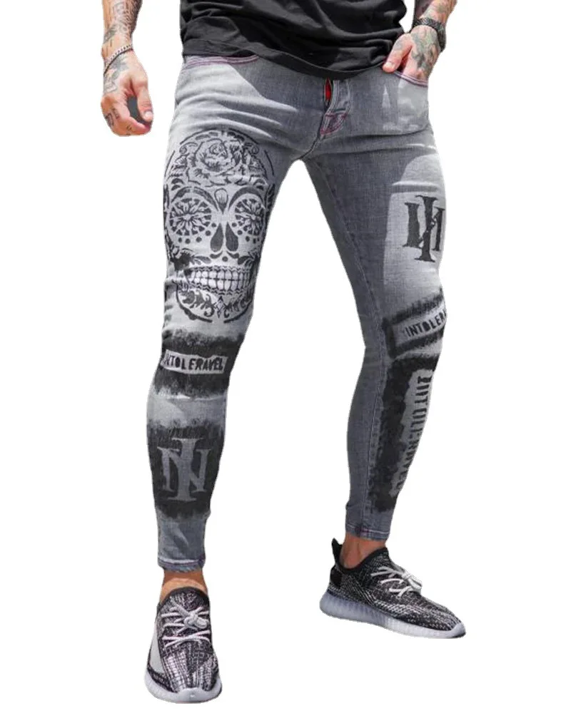Trendy Men’s Stretch Jeans Casual Pants Slim Printed Gray Jeans Men Fashion Printed Jeans Men Pencil Pants Skinny Jeans Men