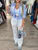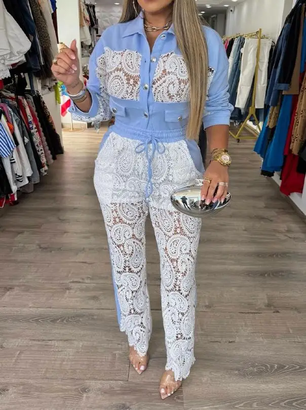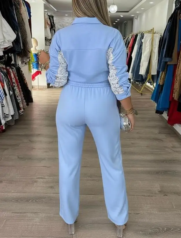 Two Piece Set Women Outfit New Turn-Down Collar Button Front Flap Detail Top & Guipure Lace Spliced Colorblock Casual Pants Set