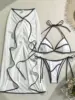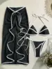 Vintage white black patchwork bikini set women ruffles pleate mesh long skirt 3 piece swimsuit 2025 beach bathing suit holiday swimwear