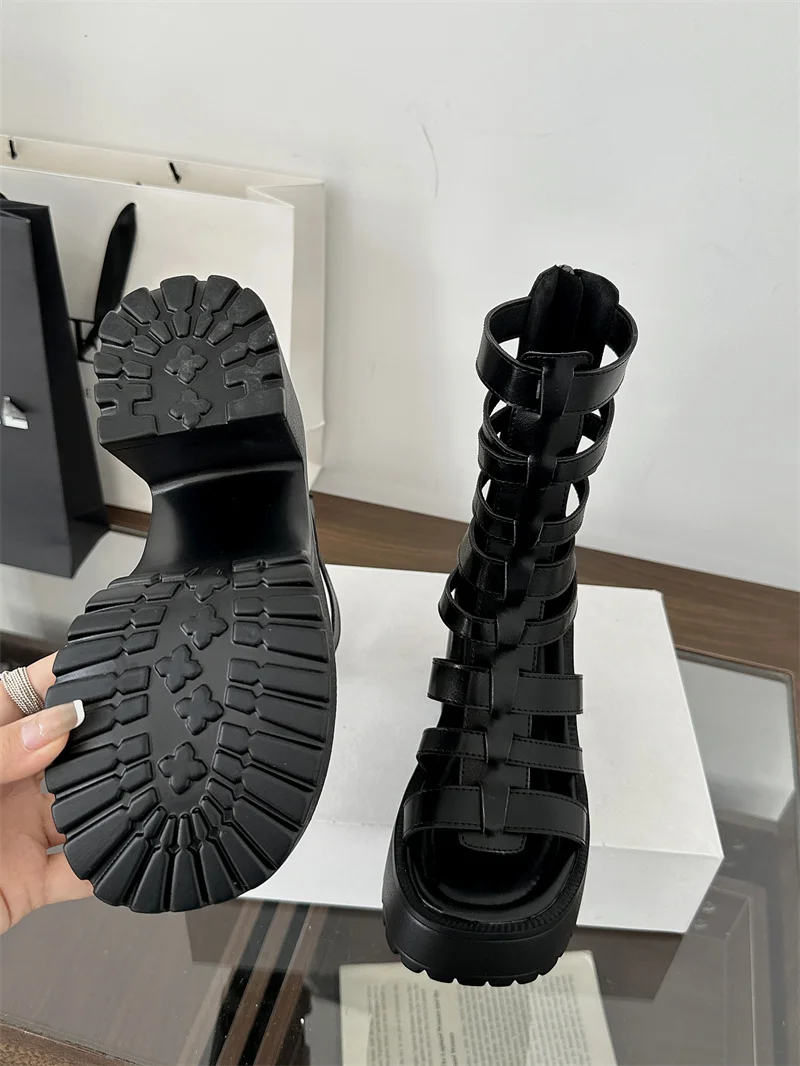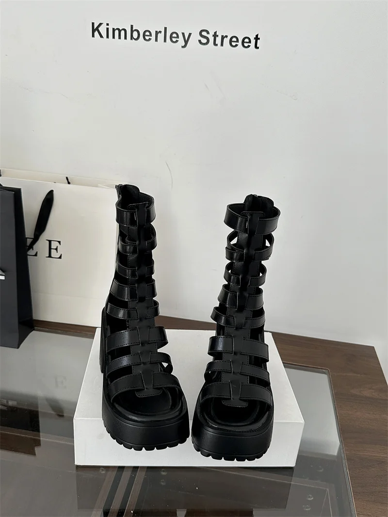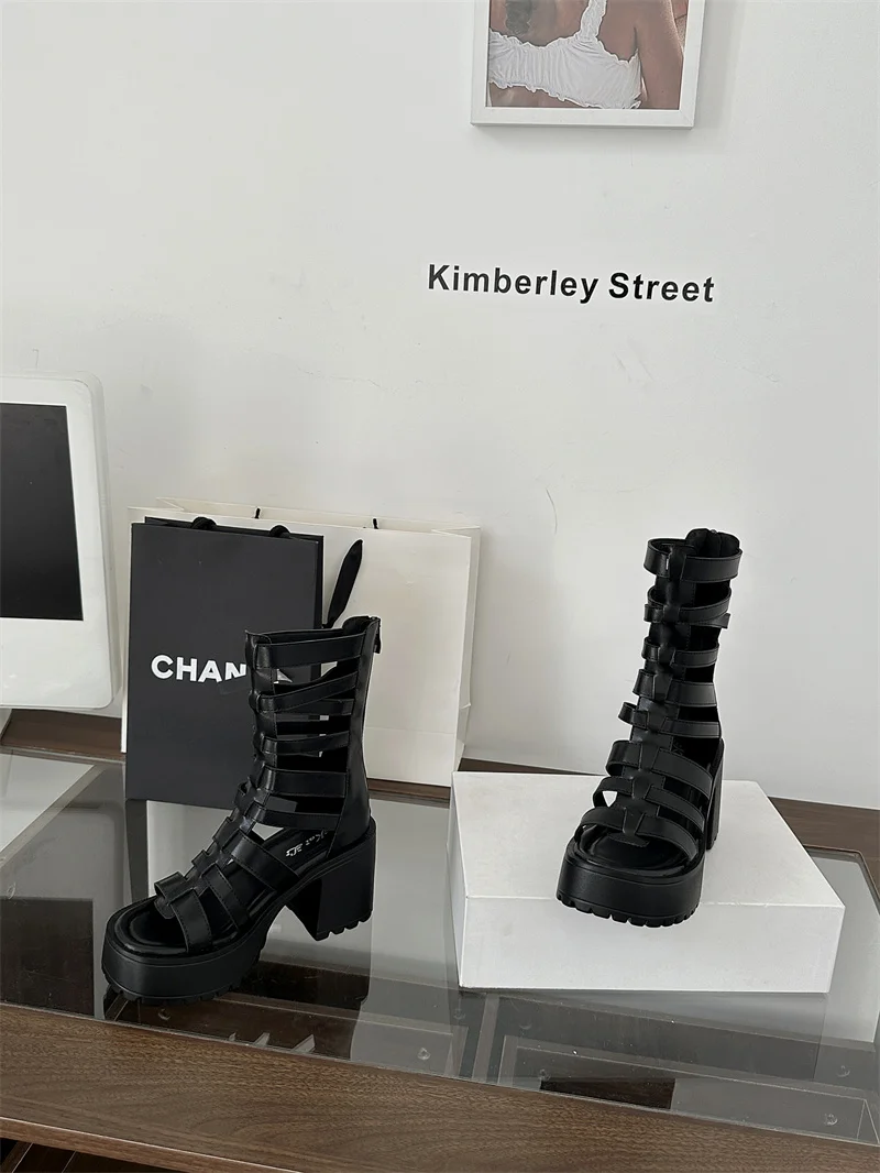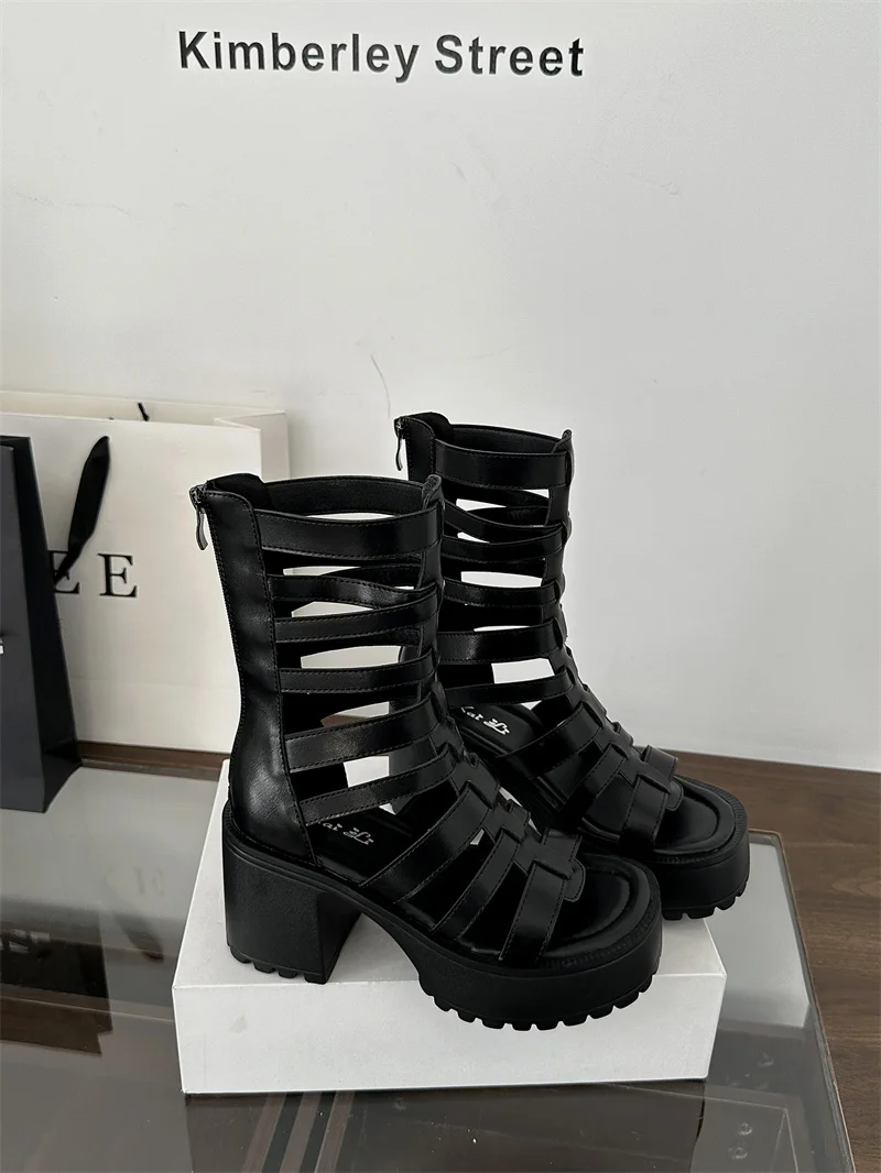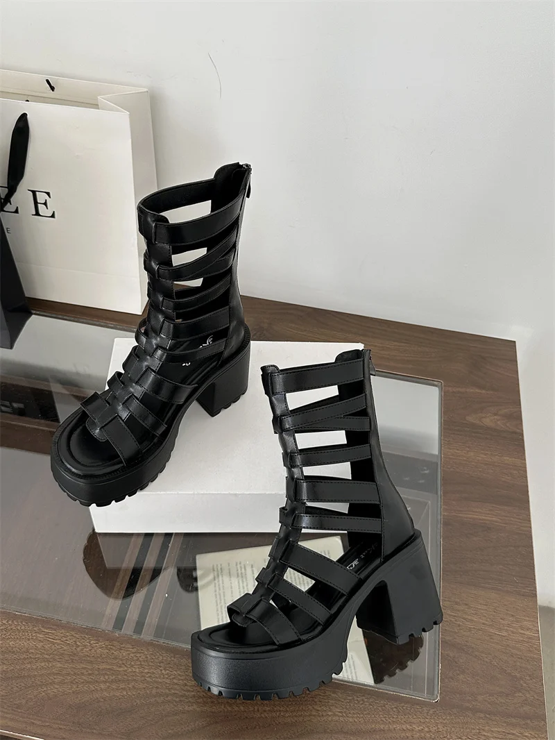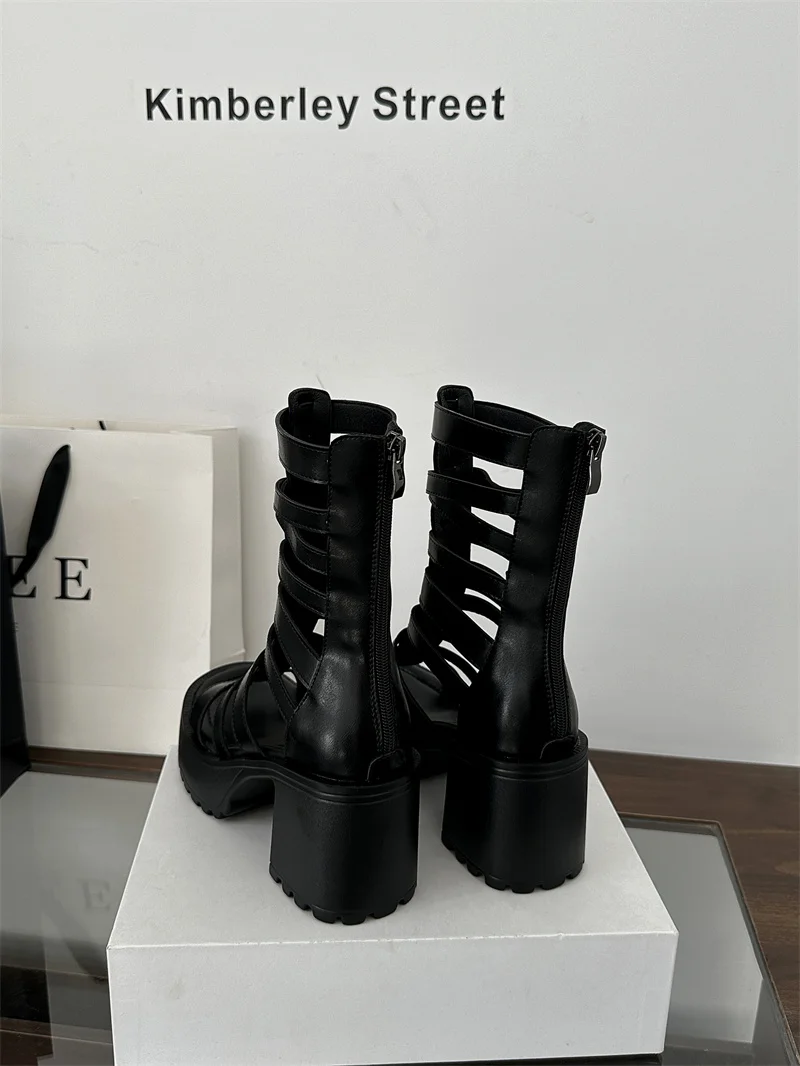 Woman Block Heels Sandals Punk Summer Boots Black Chunky Heels Platform Shoes Back Zipper High-Tie Shoes Zapatos Mujer