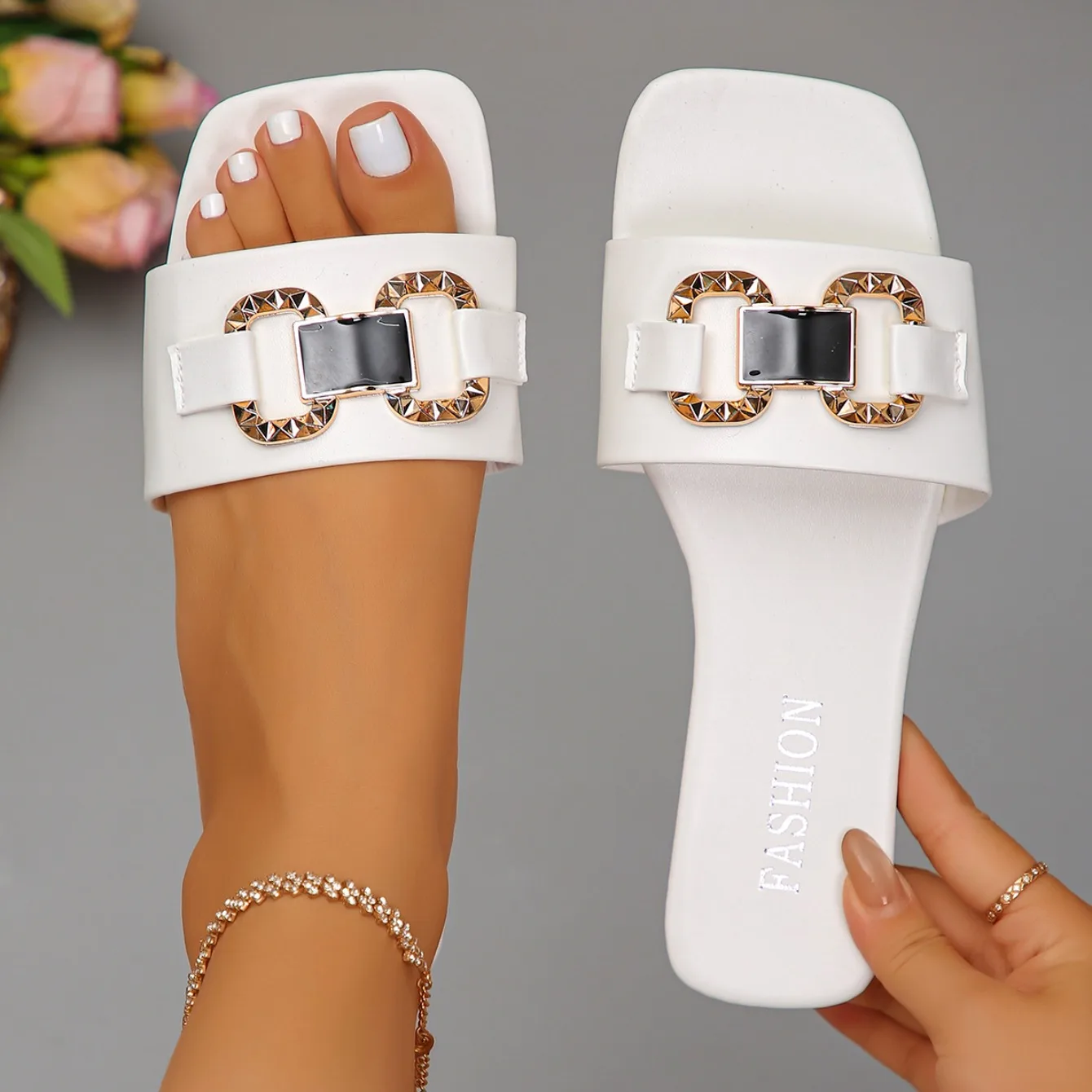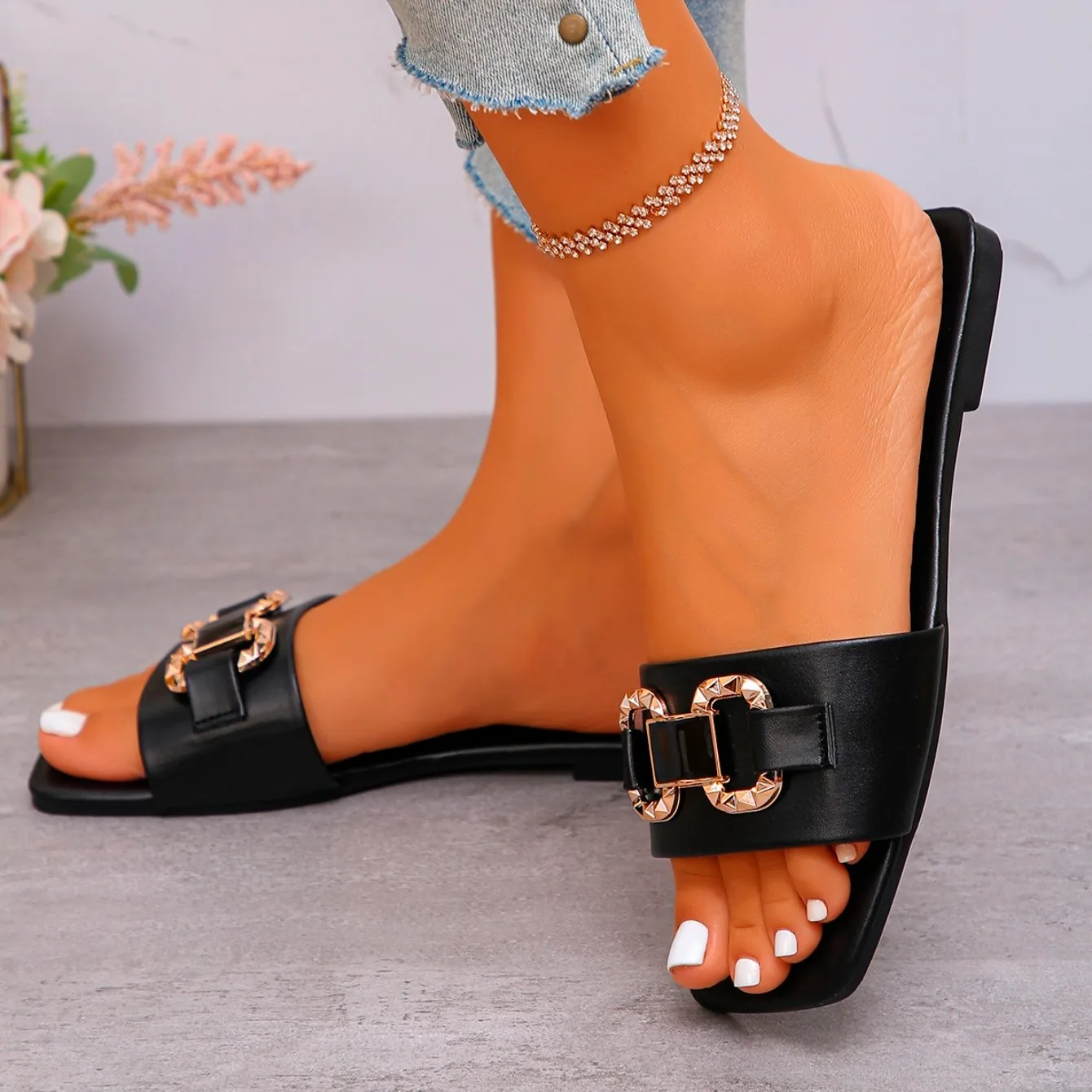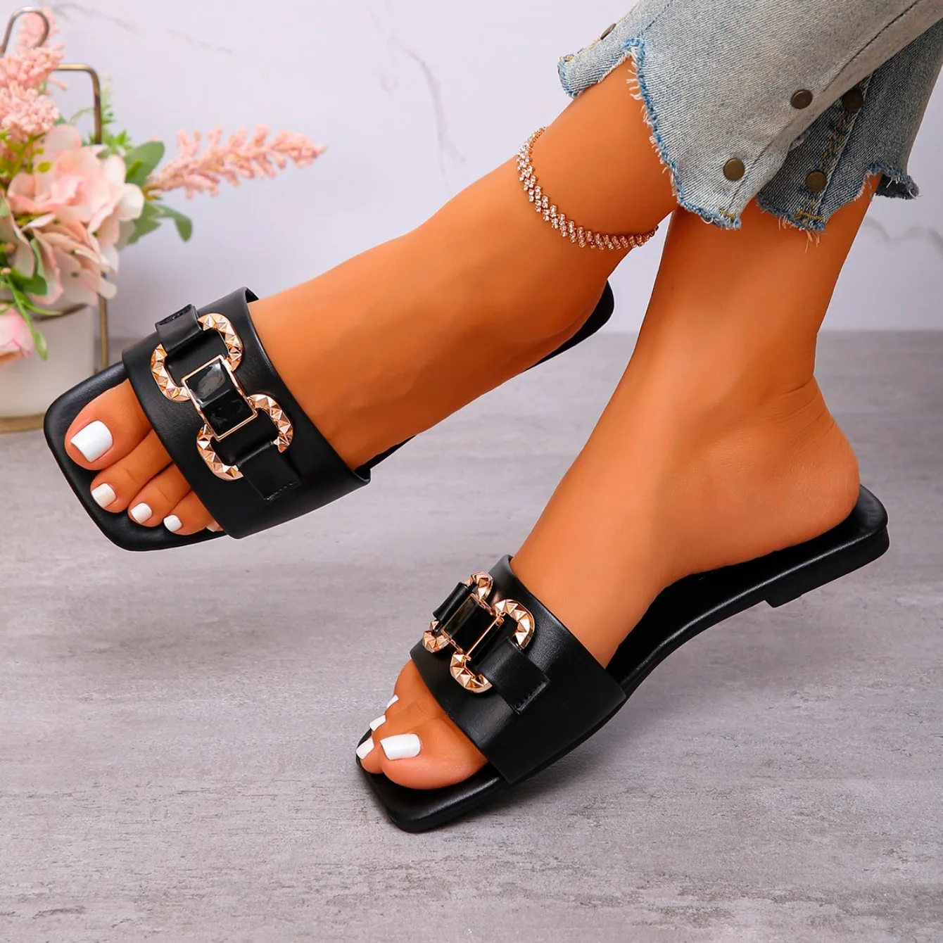 Women Fashion Casual Slippers Summer New Metal Buckle Sandals Square Head Rubber Shoes Women Sexy Slip on Slippers Slides Women