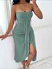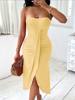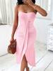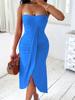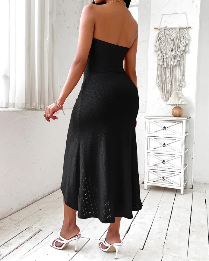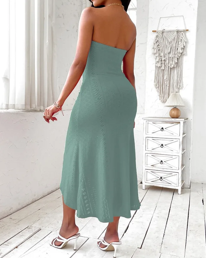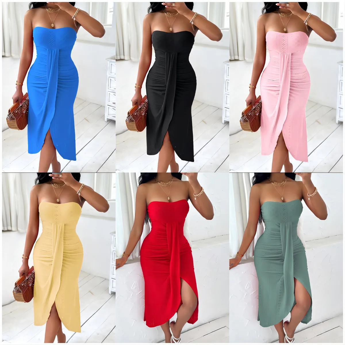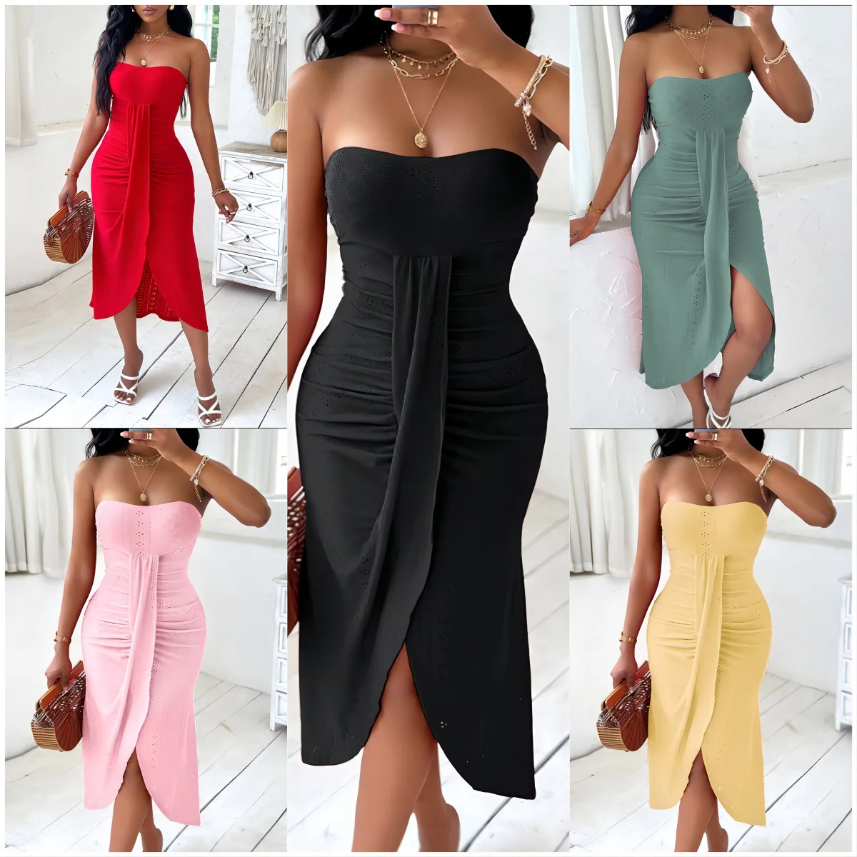 Women Sexy Backless Strapless Solid Mido Dress New Summer Bandeau Ruched Off Shoulder Hook Flower Hollow Slit Casual Dresses