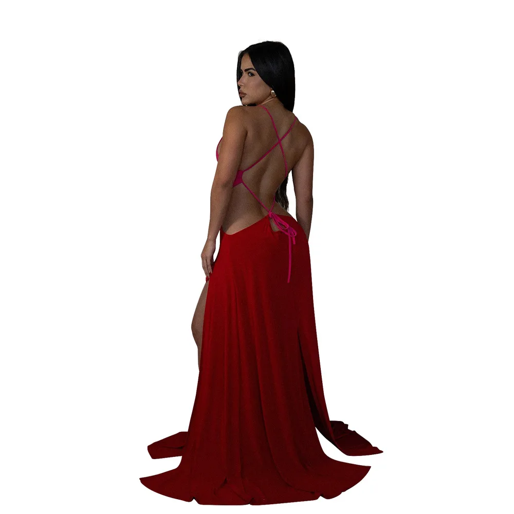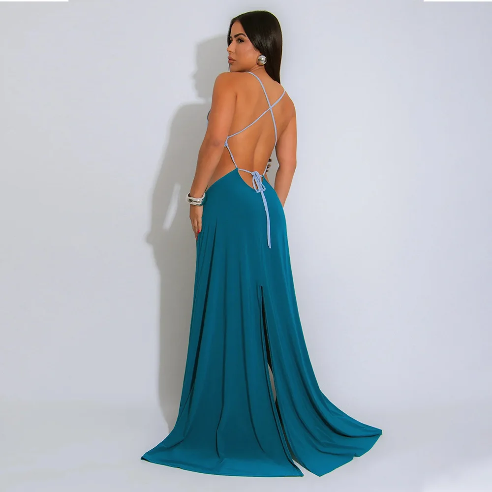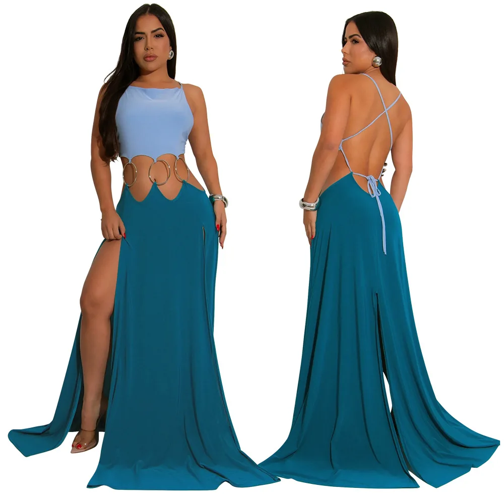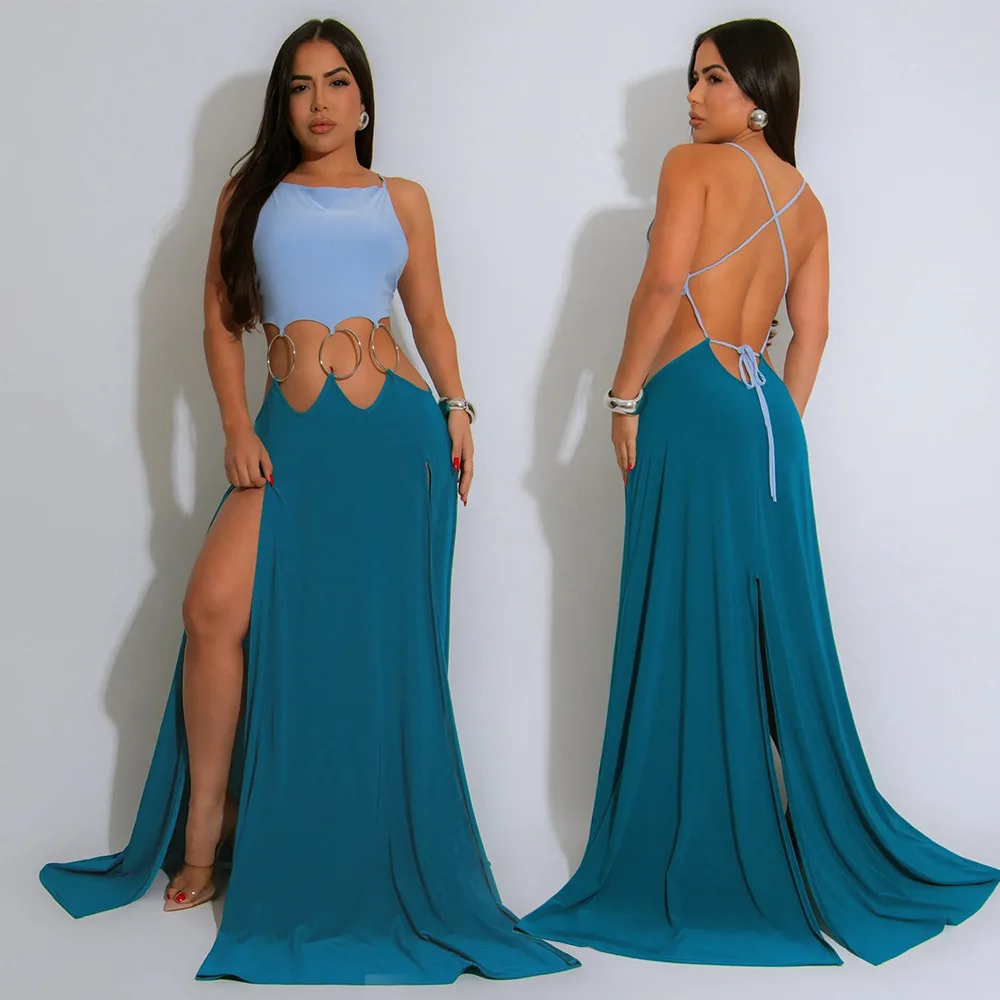 Women Sexy Lace-up Halter High Split Dress Solid Color Hollow Out High Waist Long Sleeveless Dress