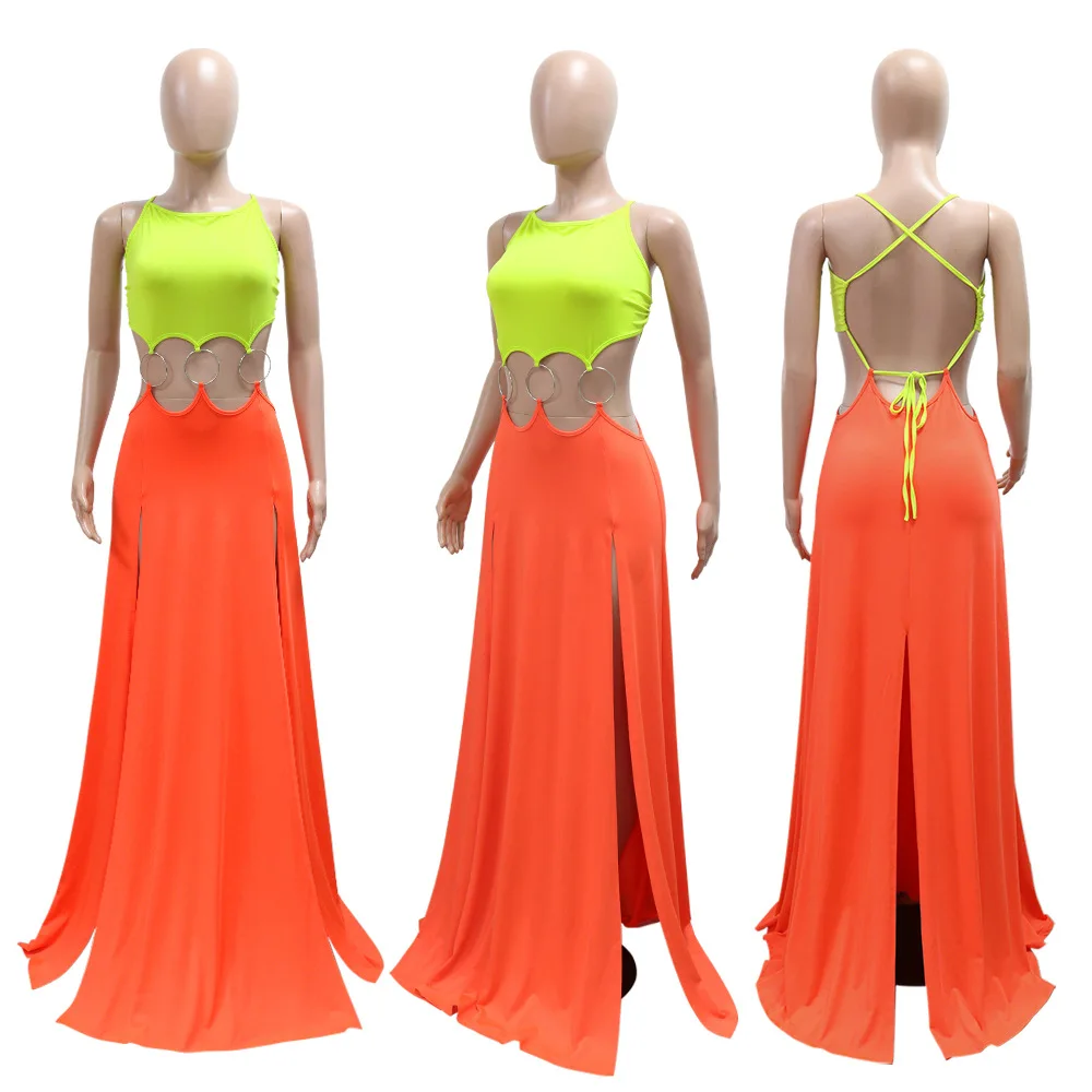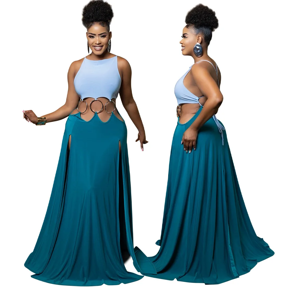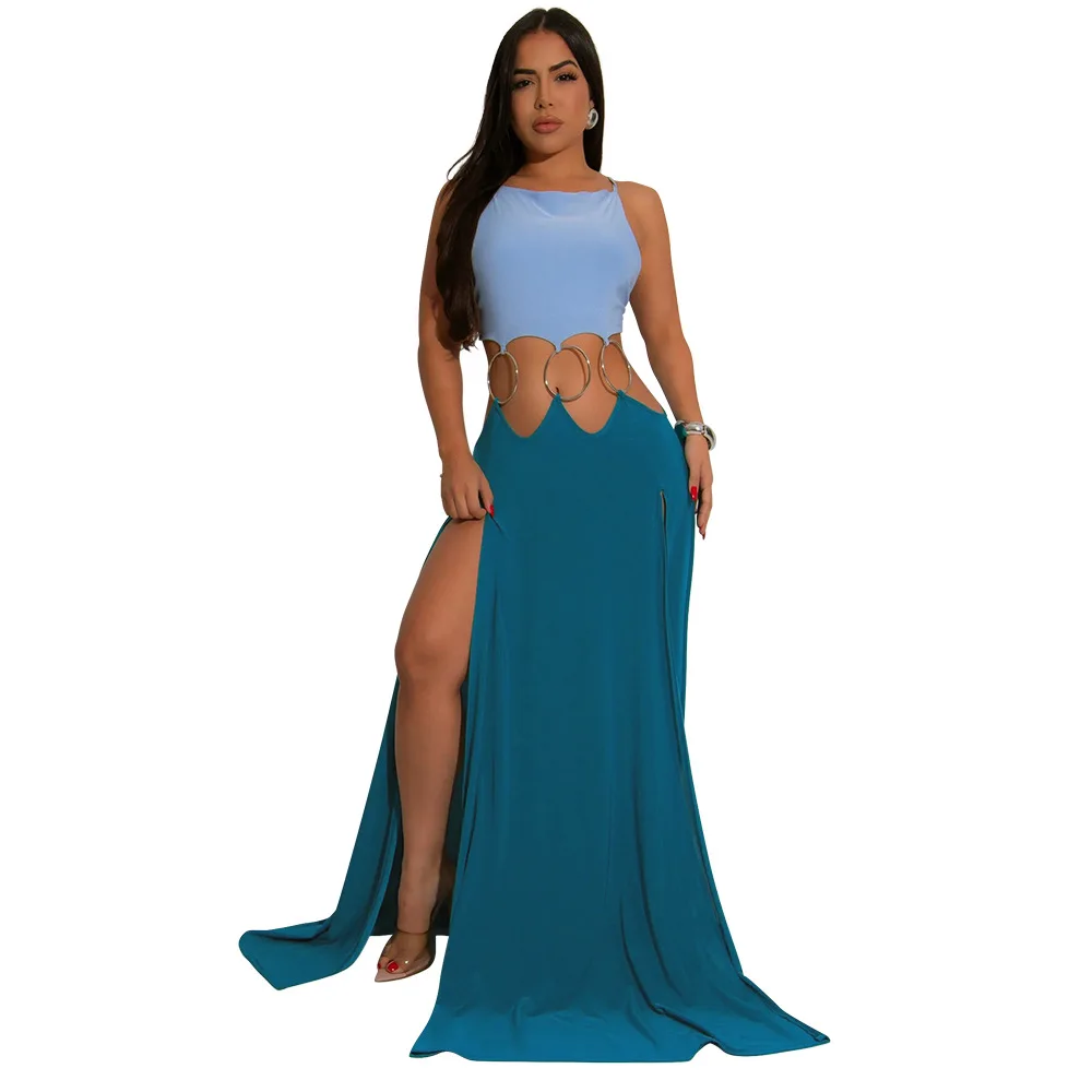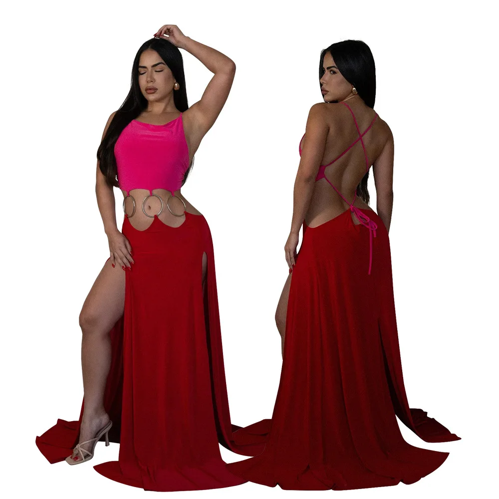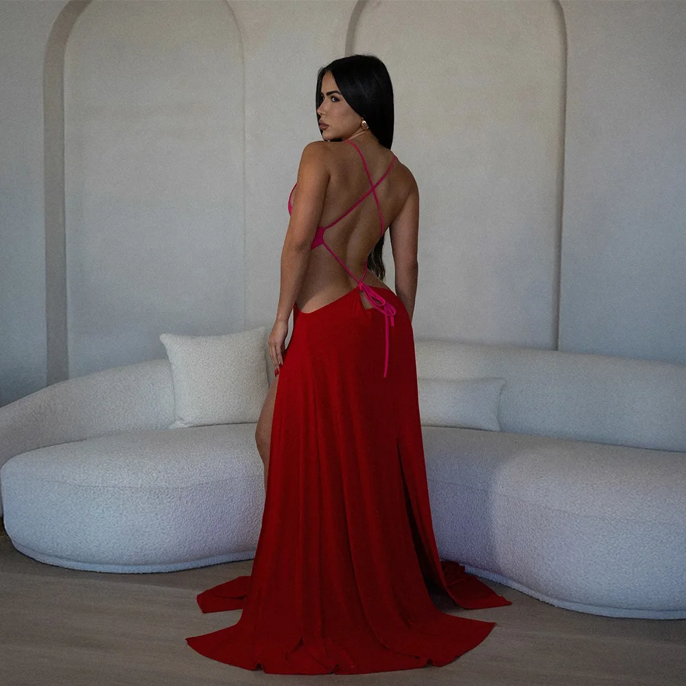 Women Sexy Lace-up Halter High Split Dress Solid Color Hollow Out High Waist Long Sleeveless Dress