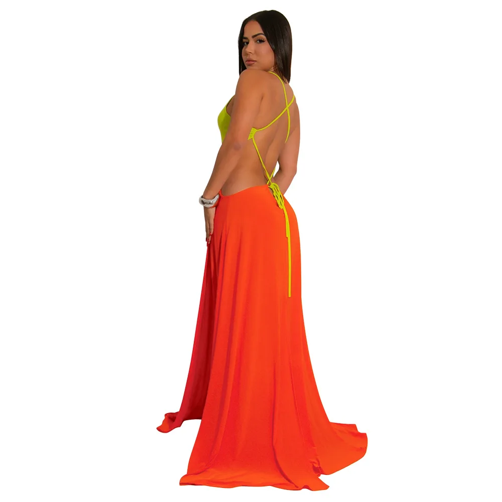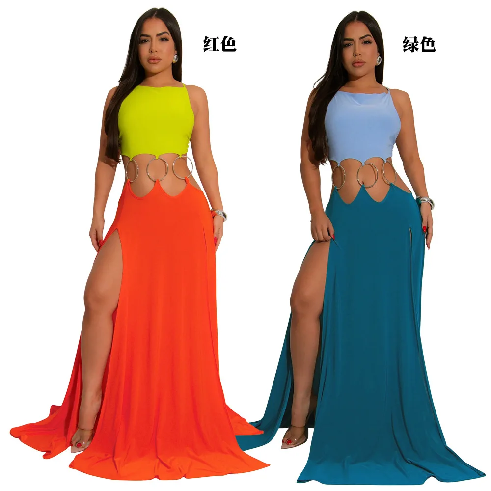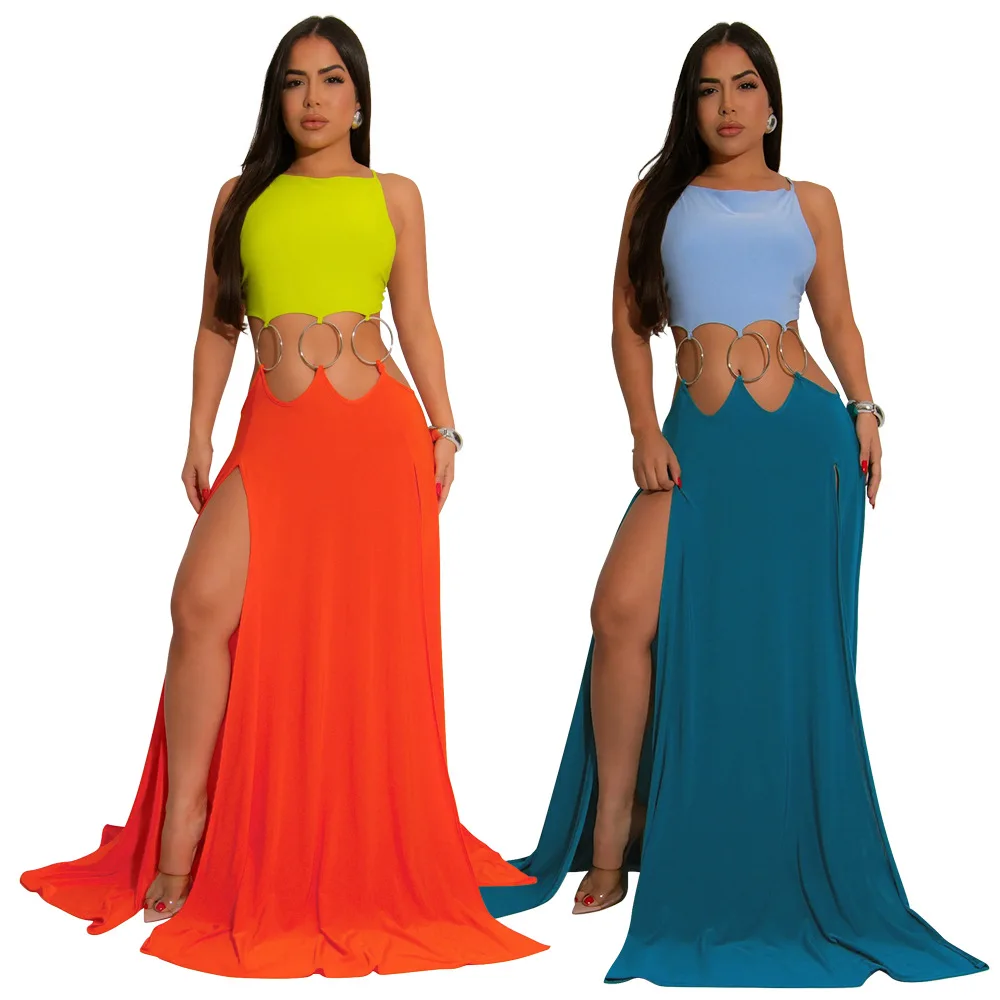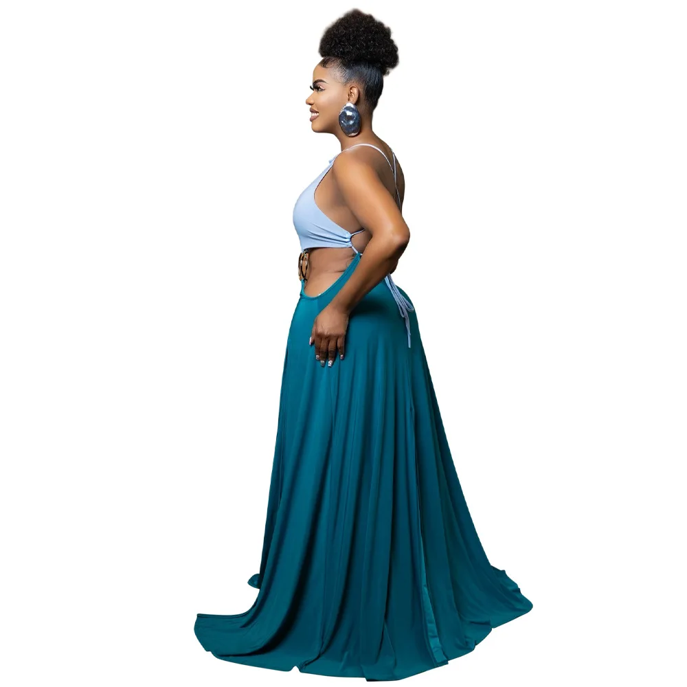 Women Sexy Lace-up Halter High Split Dress Solid Color Hollow Out High Waist Long Sleeveless Dress