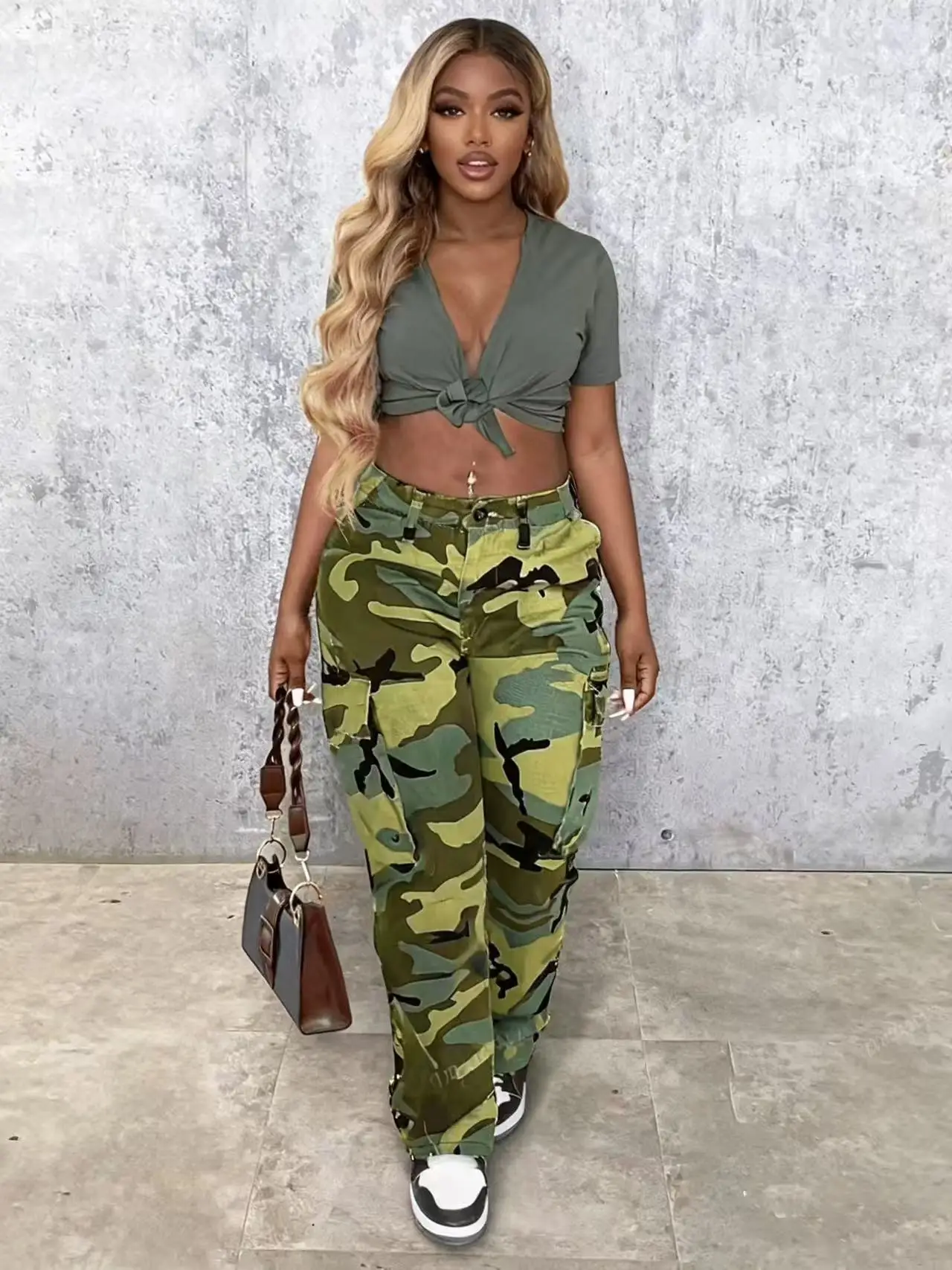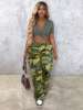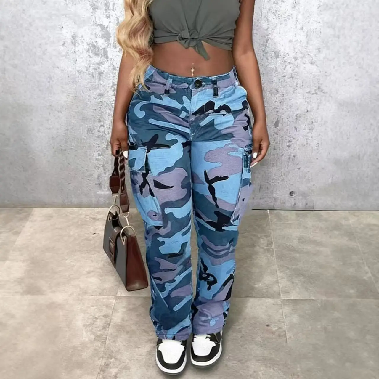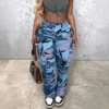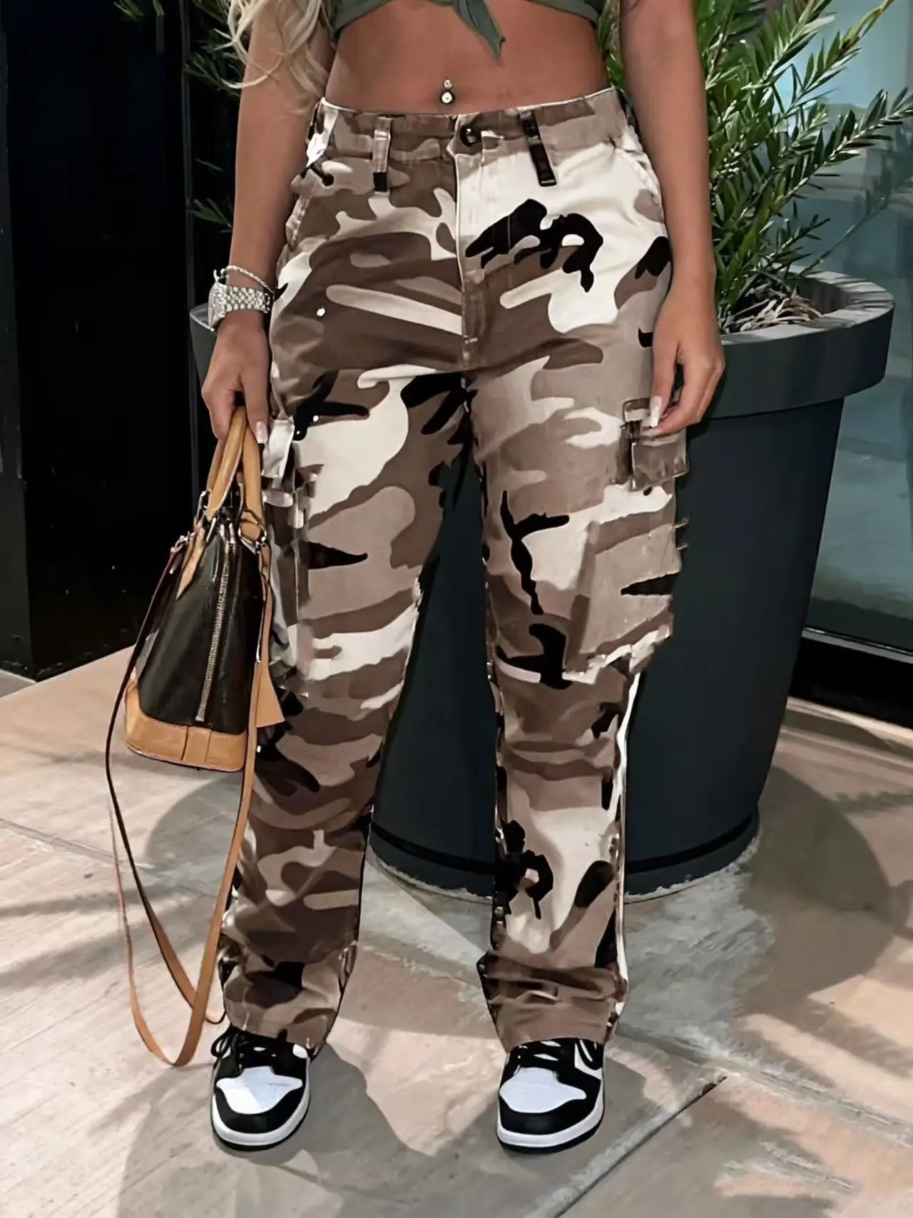 Women’s Classic Multi-Pocket Camo Pants, Fitted Straight Leg, Elastic Waist with Button Closure, Casual Fashion for All Seasons