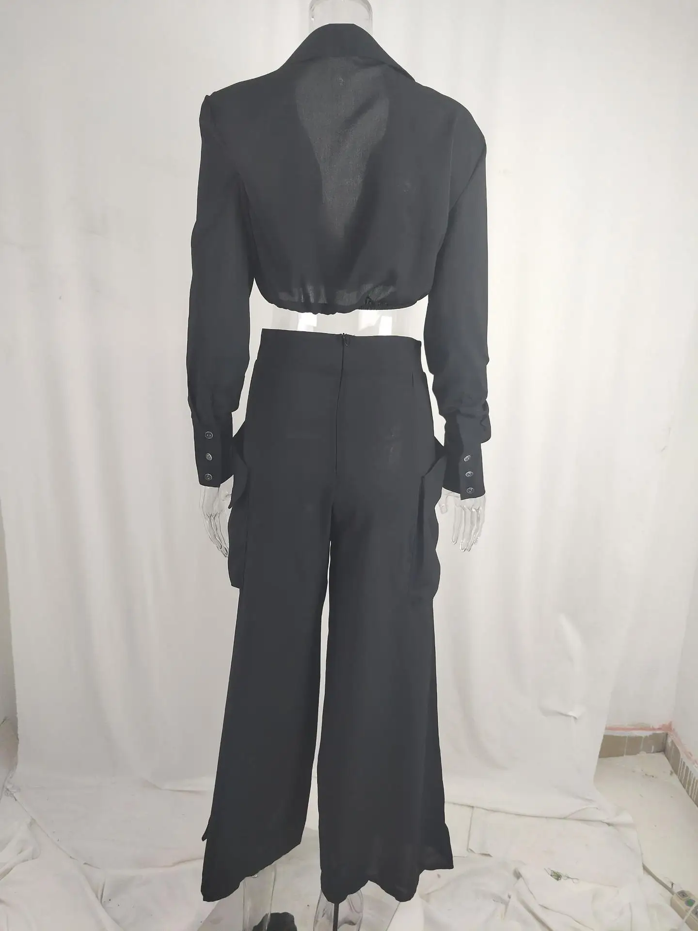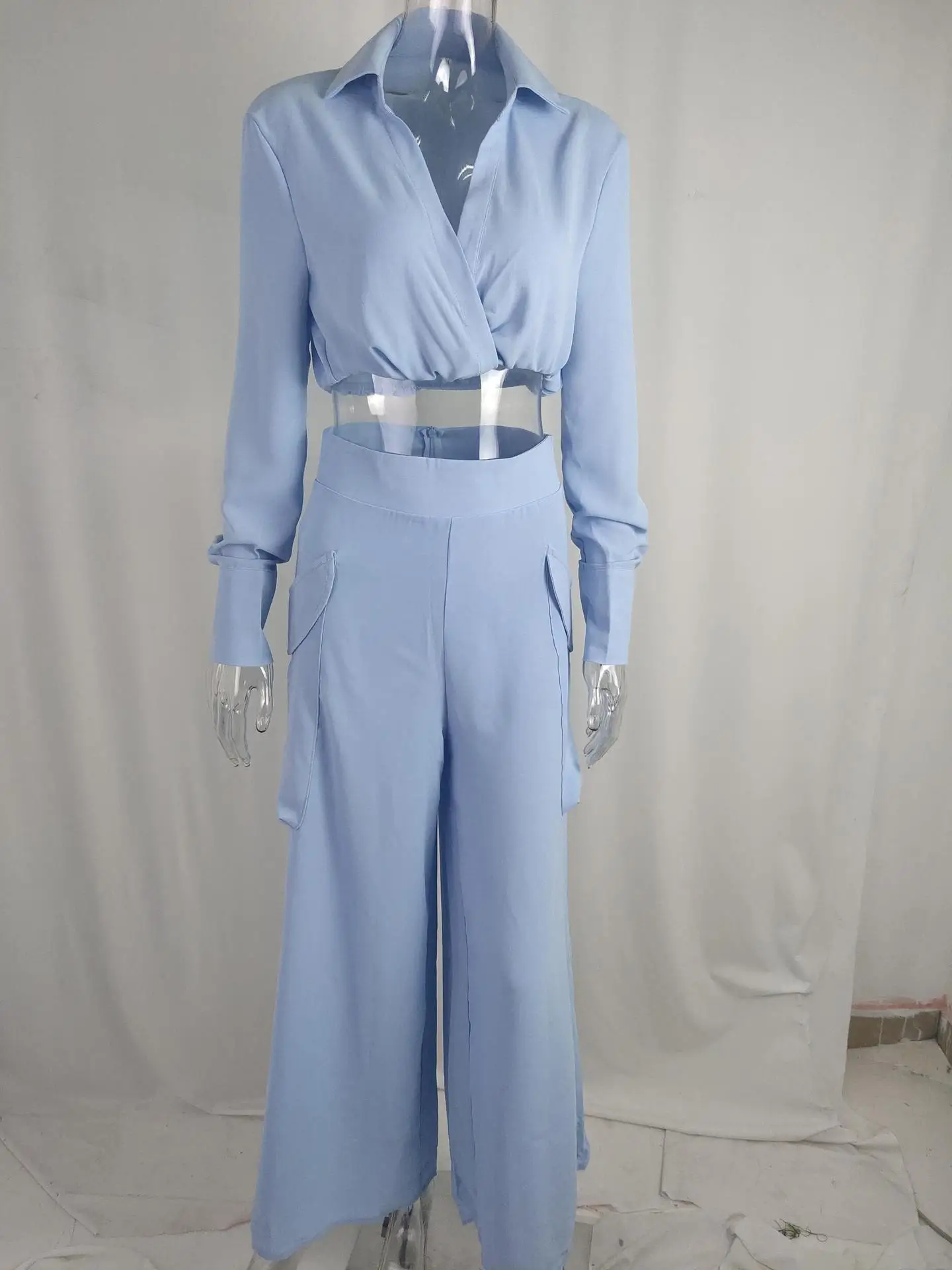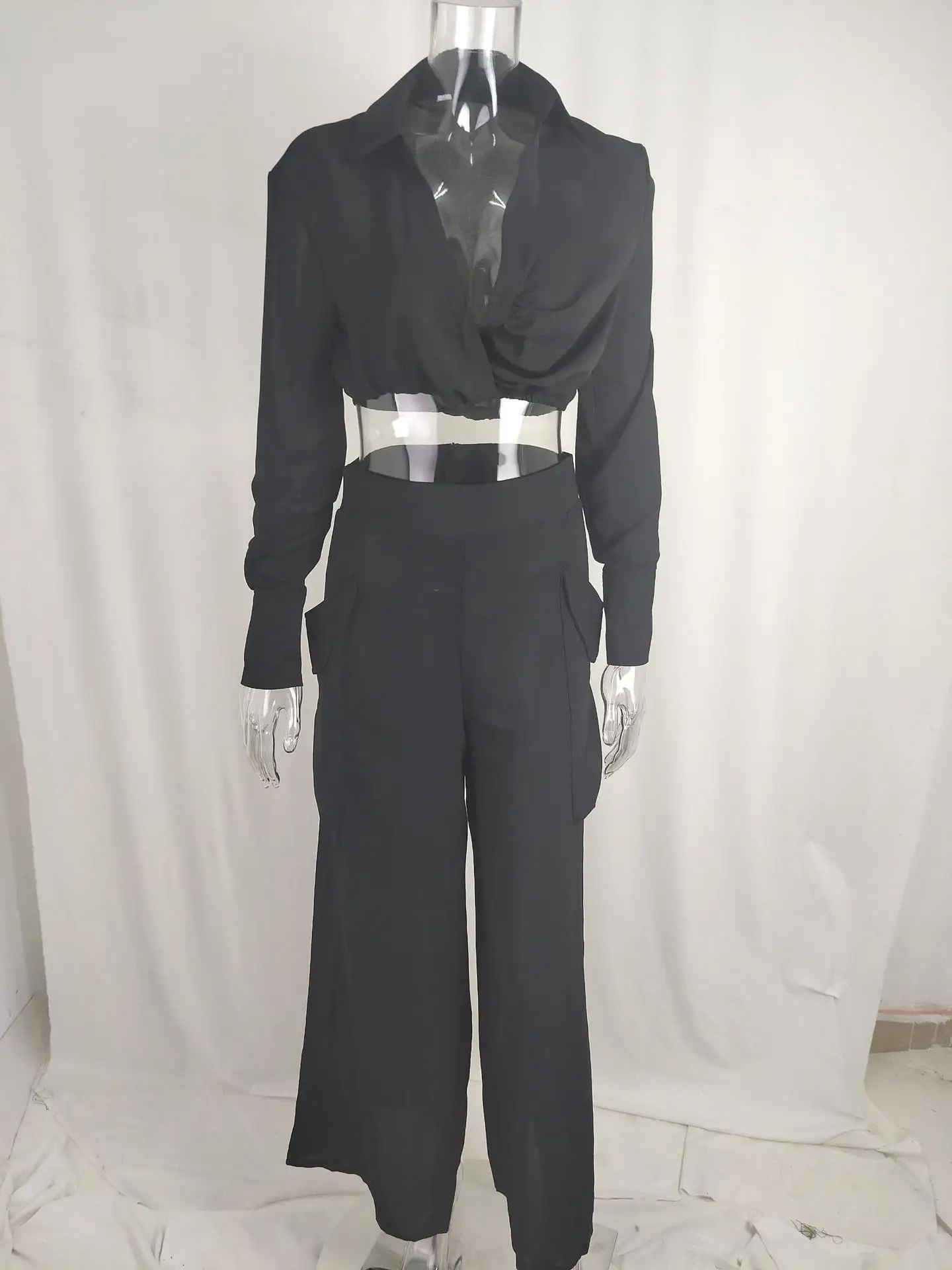 Women’s Elegant Pants Sets Solid Long Sleeve Crop Shirt & High Waist Pants Two Piece Set Casual Work Suit Female V-Neck Top