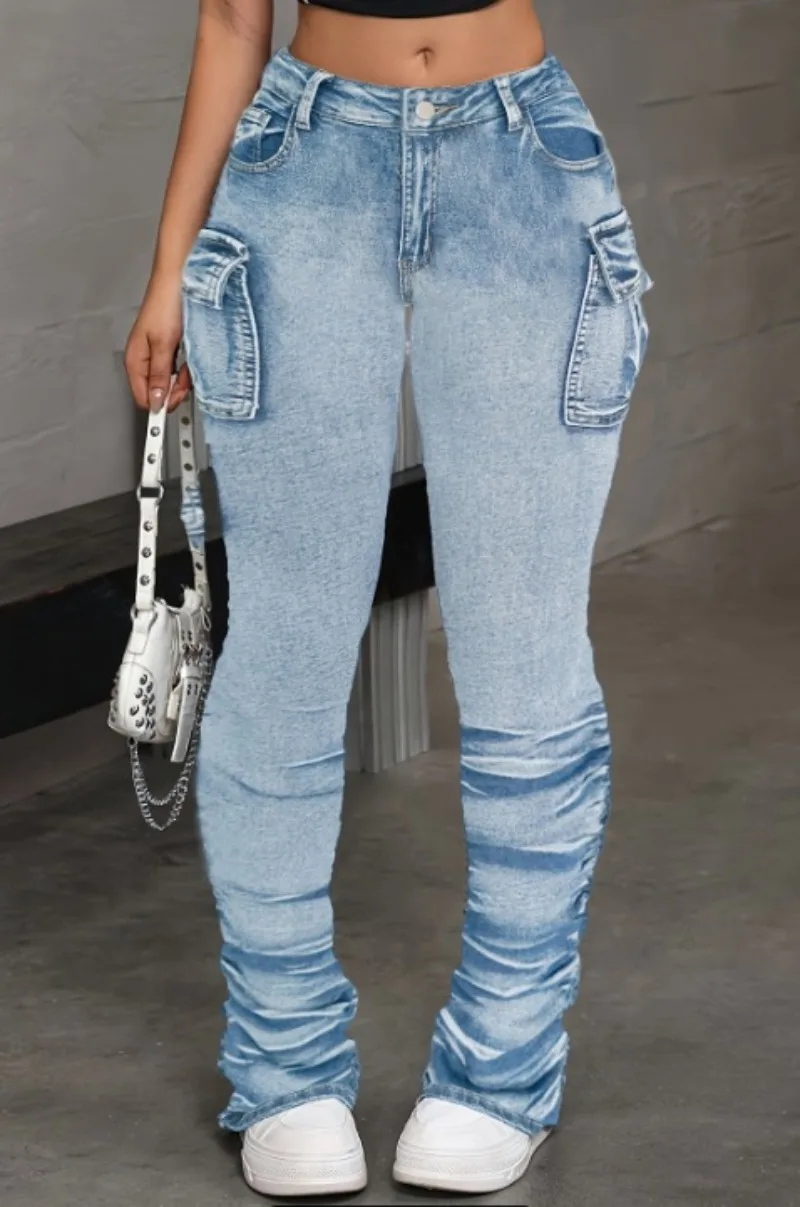 Women’s High Waisted Elastic Casual Leg Stack Jeans Sexy Hip Lifting Street Style Multi Pocket Workwear Jeans