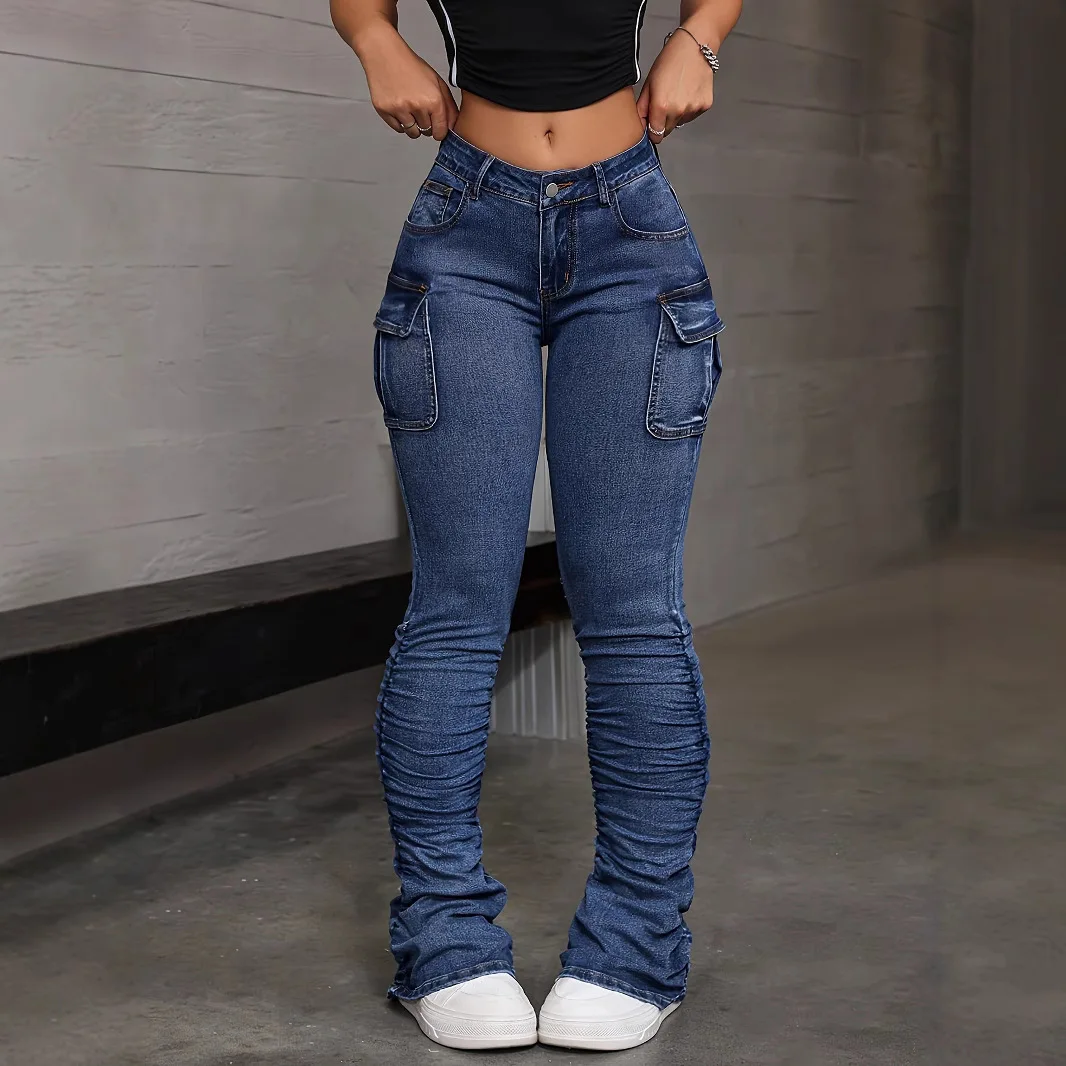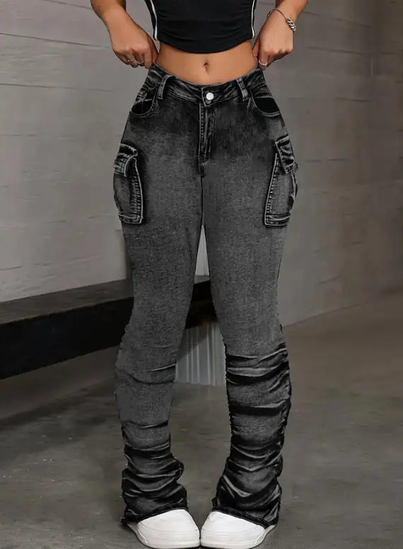 Women’s High Waisted Elastic Casual Leg Stack Jeans Sexy Hip Lifting Street Style Multi Pocket Workwear Jeans