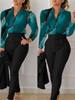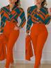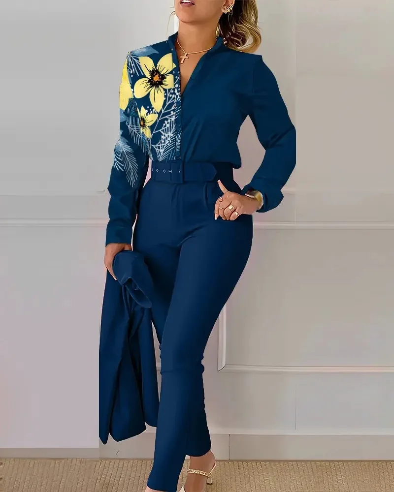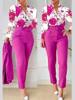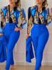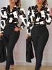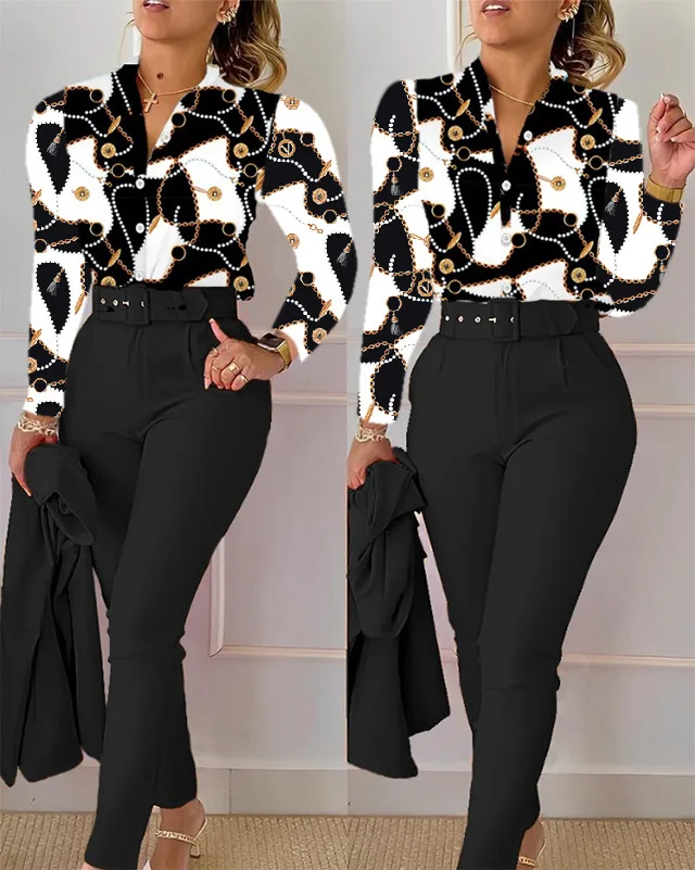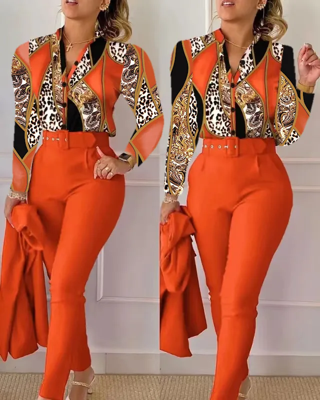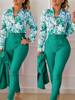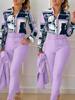 Women’s Shirt 2 Pieces Suit Set 2024 Fall Print V Neck Long Sleeve Top Casual High Waist Pockets Work Female Clothes Pants Set
