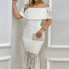 Women’s White Off-Shoulder Lace Midi Dress Ruffled Neckline Flared Hem Ideal for Evening Parties Wedding Receptions