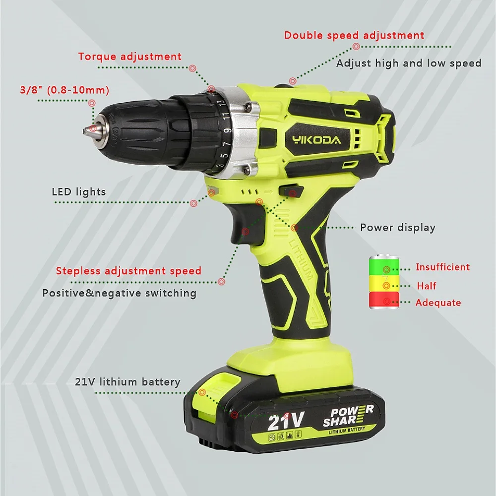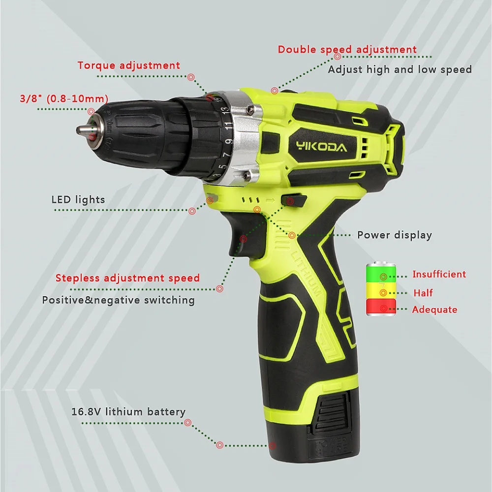YIKODA 12V/16.8V/21V Electric Screwdriver Cordless Drill Rechargeable Lithium Battery Mini Wireless Power Driver Tools