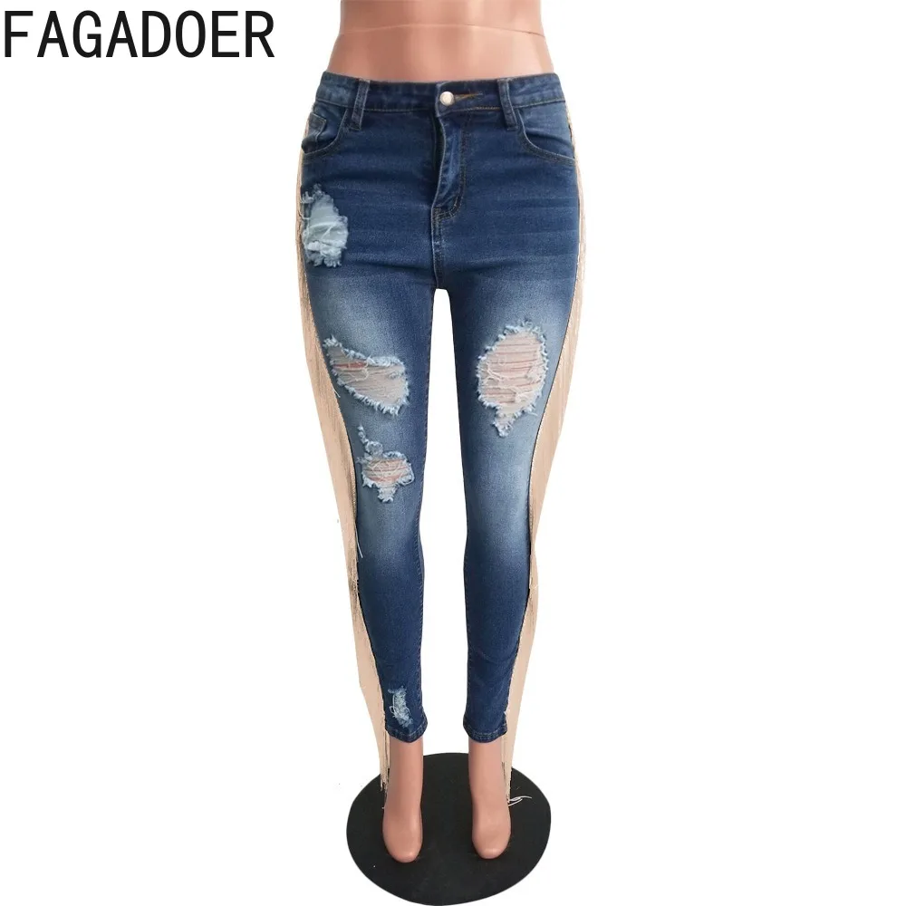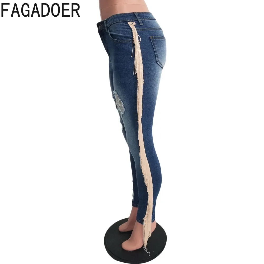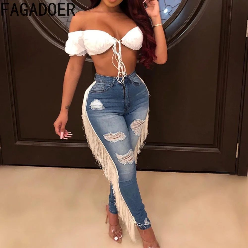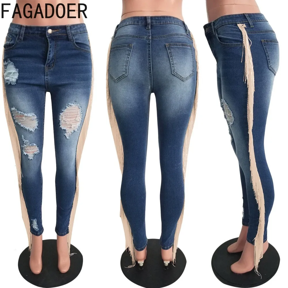 FAGADOER Fashion Denim Tassels Skinny Pants Women High Waisted Hole Pocket Jean Trousers Casual Female Solid Cowboy Streetwear