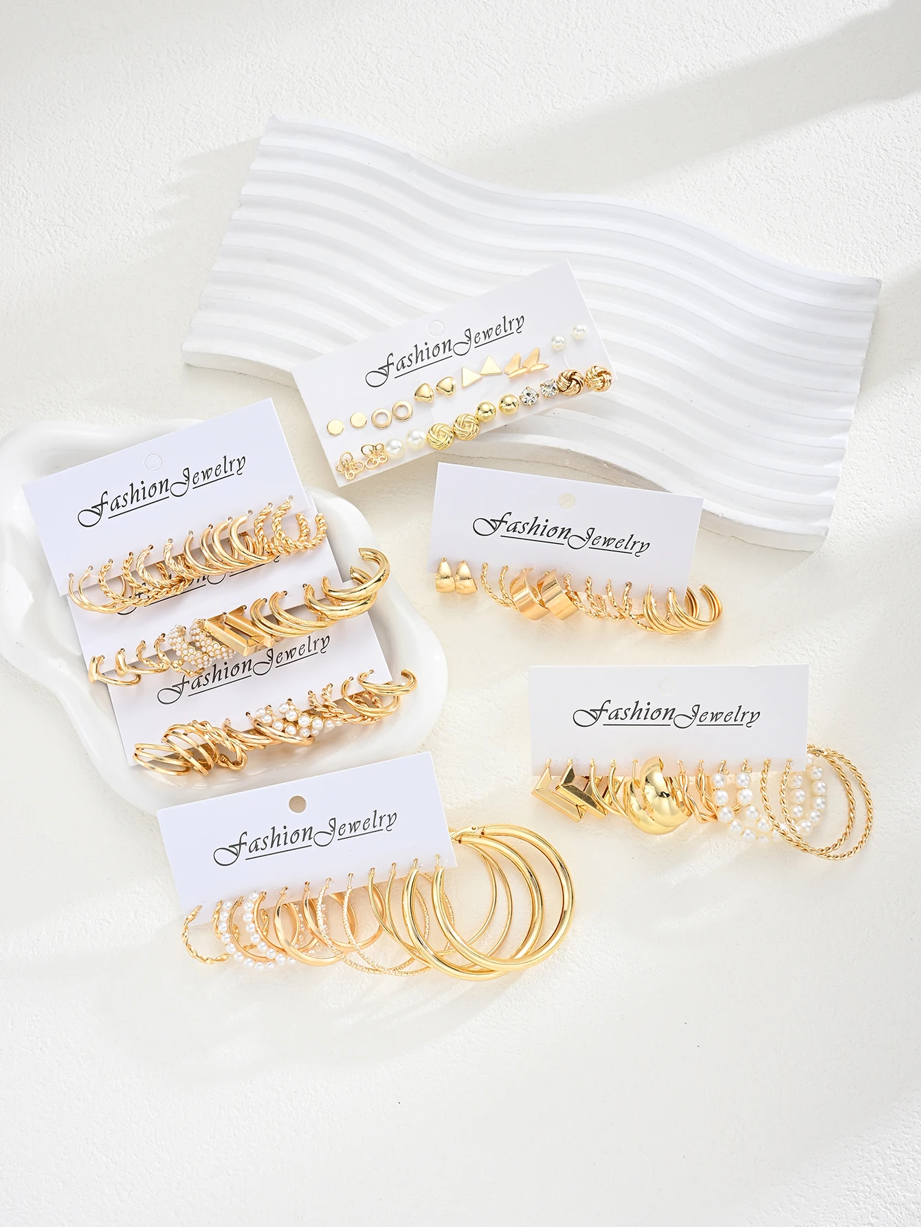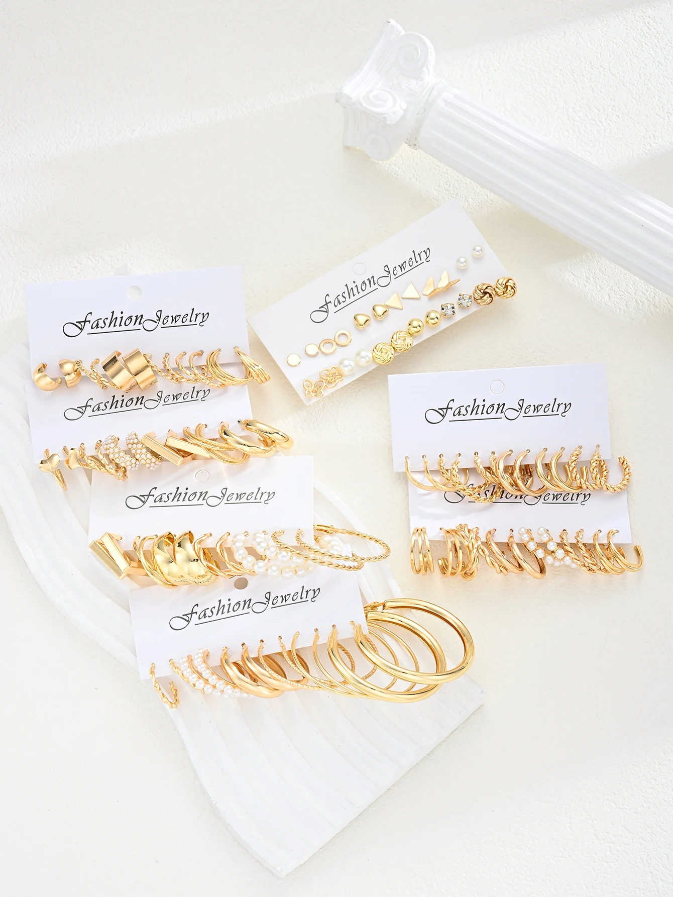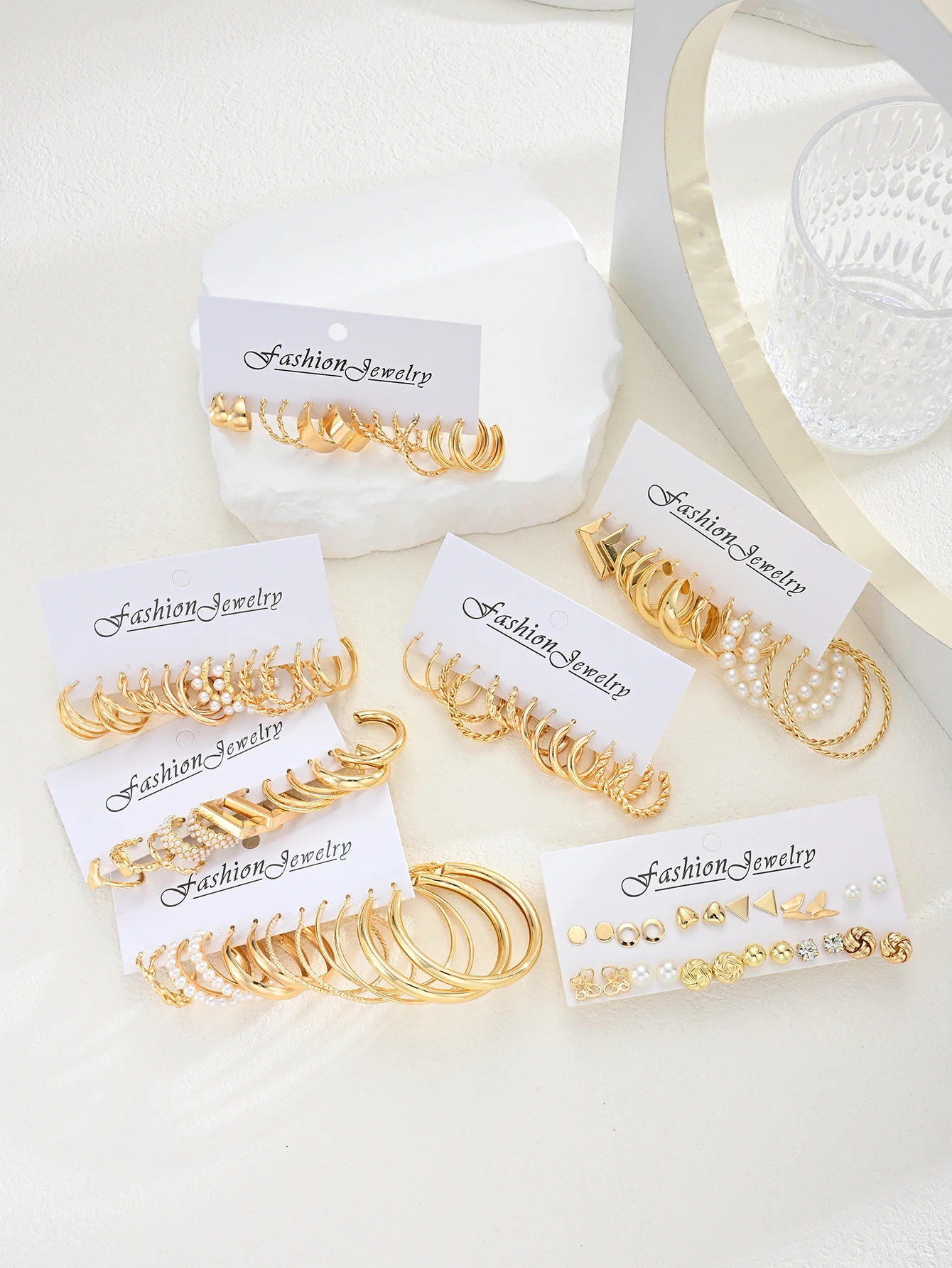 Fashion Geometric Gold Color Earring Set for Women Vintage Multi-Element Pearl Twist C-shaped Hoop Earrings Daily Party Jewelry
