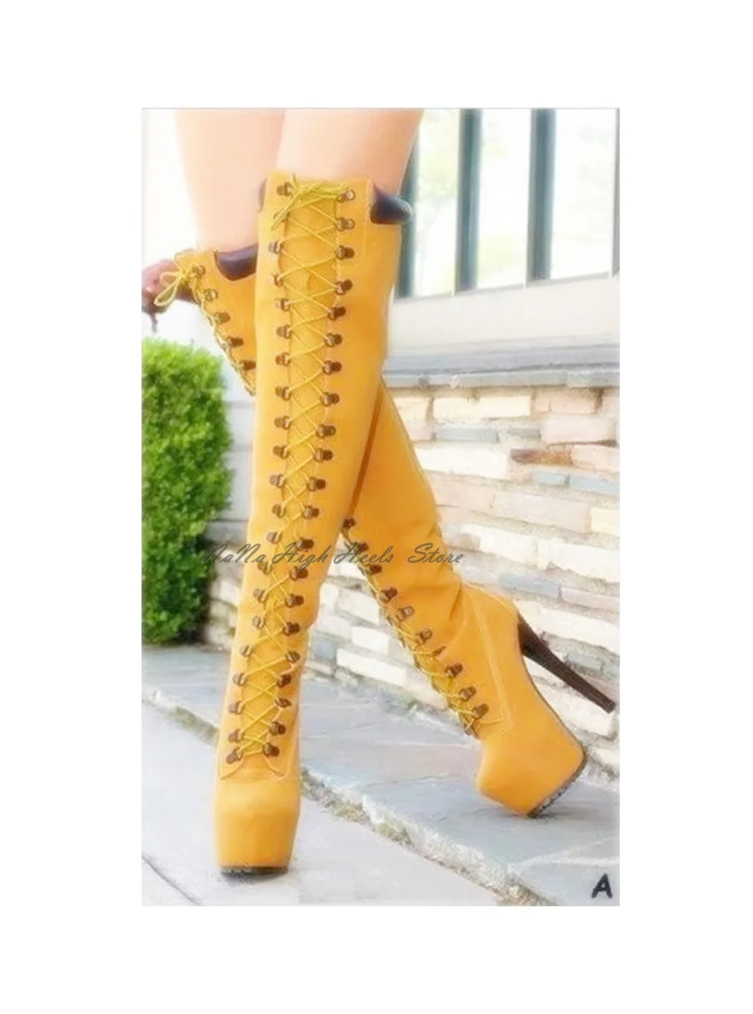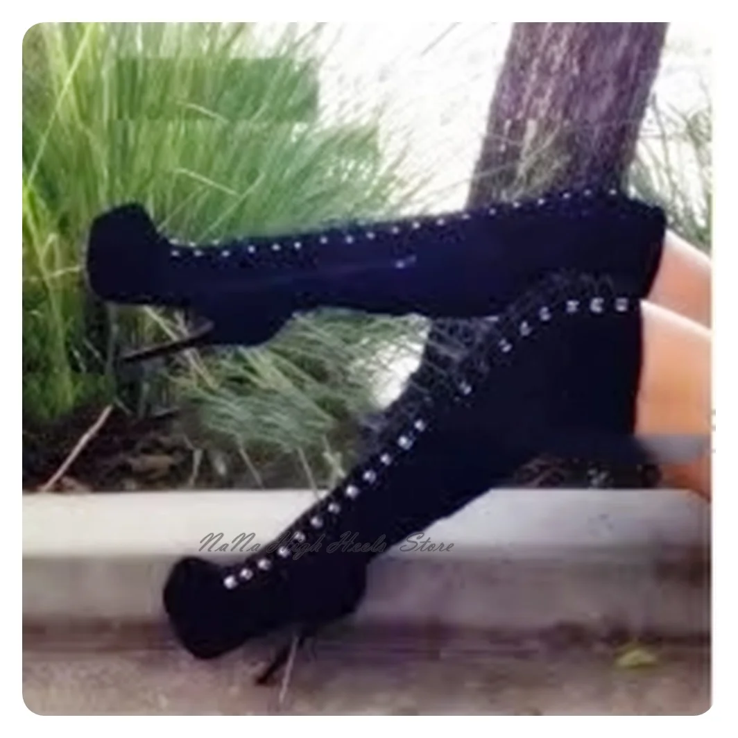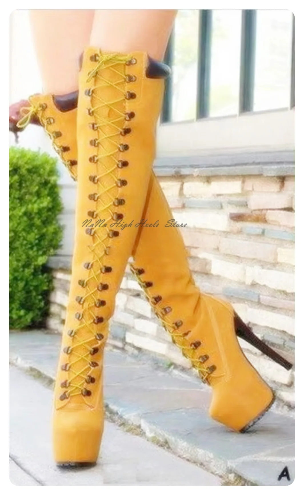 Fashion Suede Platform Cross Strap Boots Women Thigh High Stiletto High Heel Sexy Boots Design Lady Round Toe Party Shoes