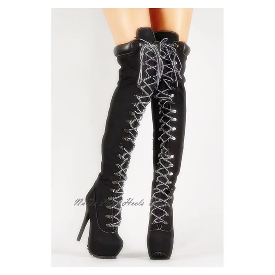 Fashion Suede Platform Cross Strap Boots Women Thigh High Stiletto High Heel Sexy Boots Design Lady Round Toe Party Shoes