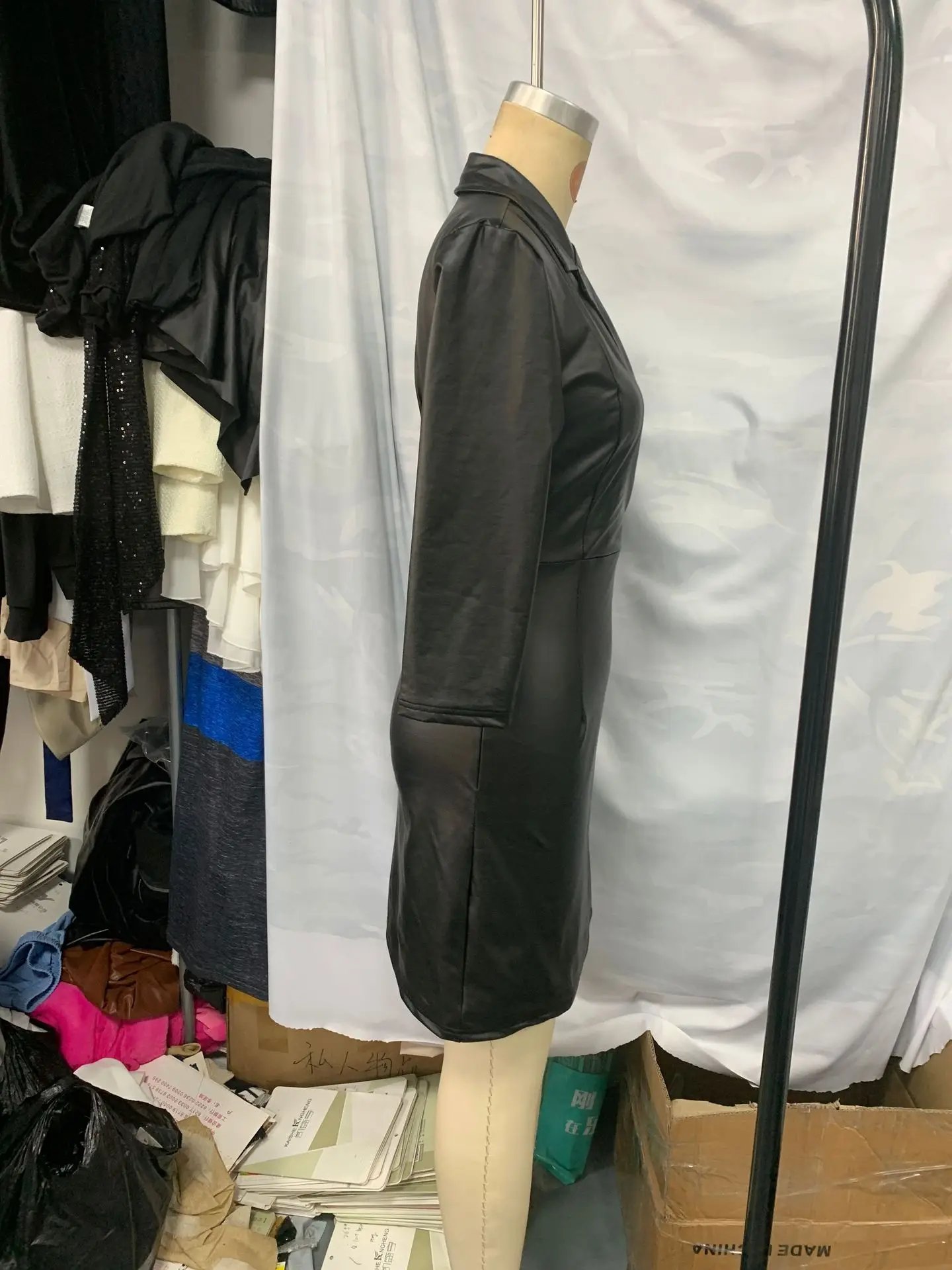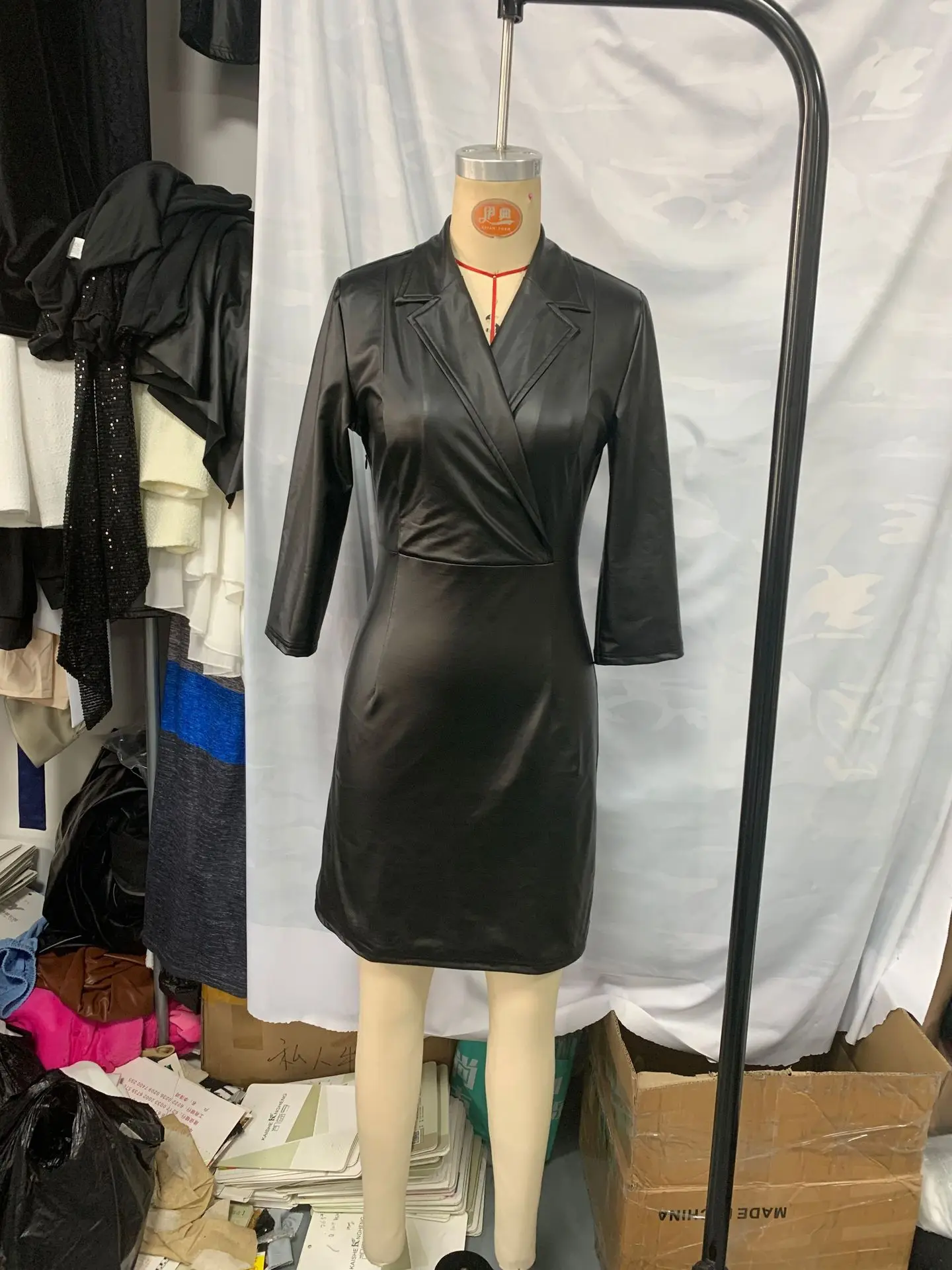Fashionable Pure Black PU Leather Women’s Dress Sexy V-neck Slim Fit Dress 2025 Autumn And Winter Temperament Commuting Vestido