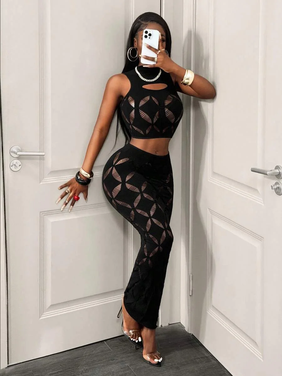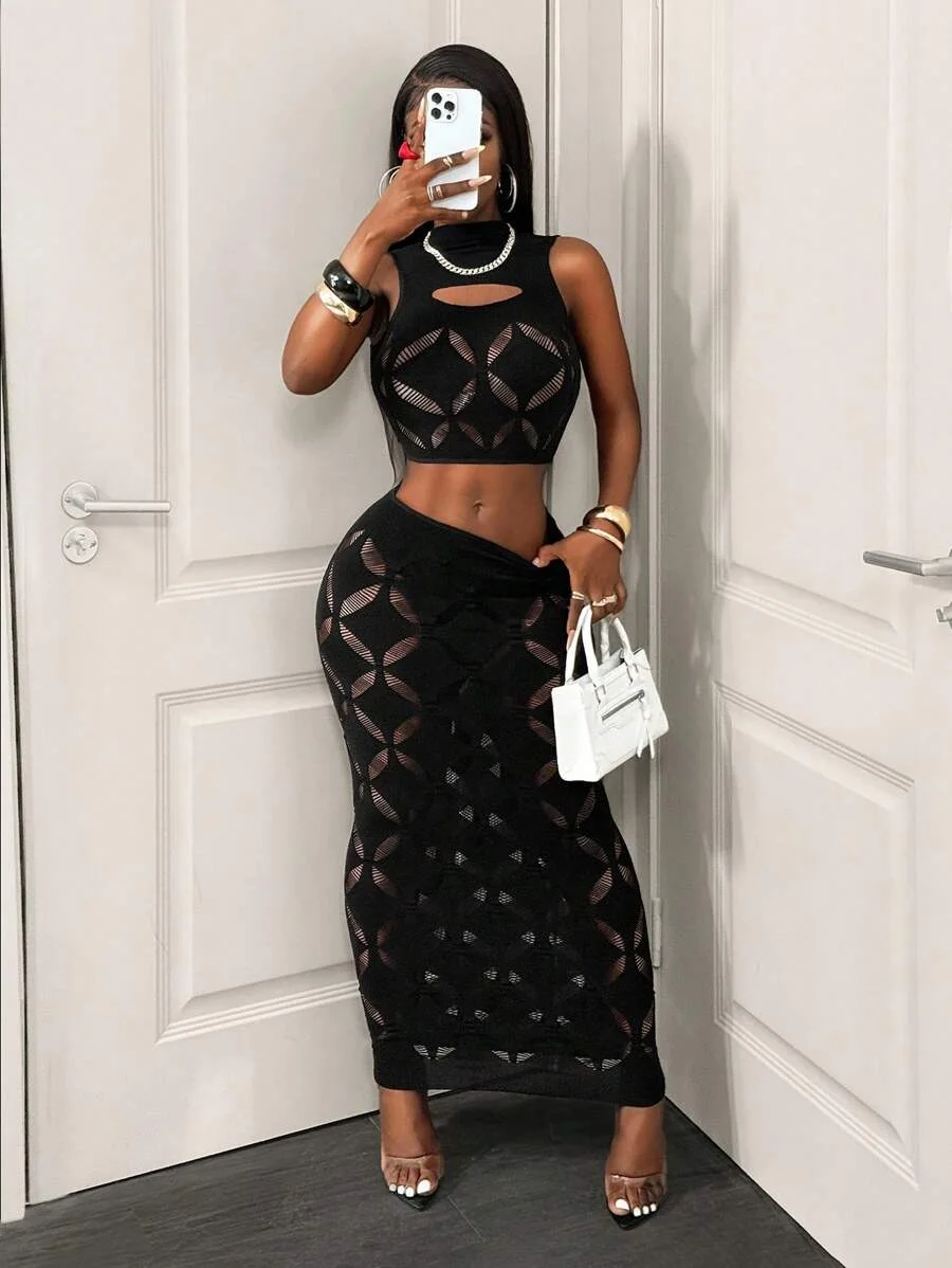 FHSEER 2PCS Women’s Sexy Set Plus Size Black Mesh Hollow Out Crop Tank & High Waist Bodycon Mini Skirt Lace Stretechy Clubwear