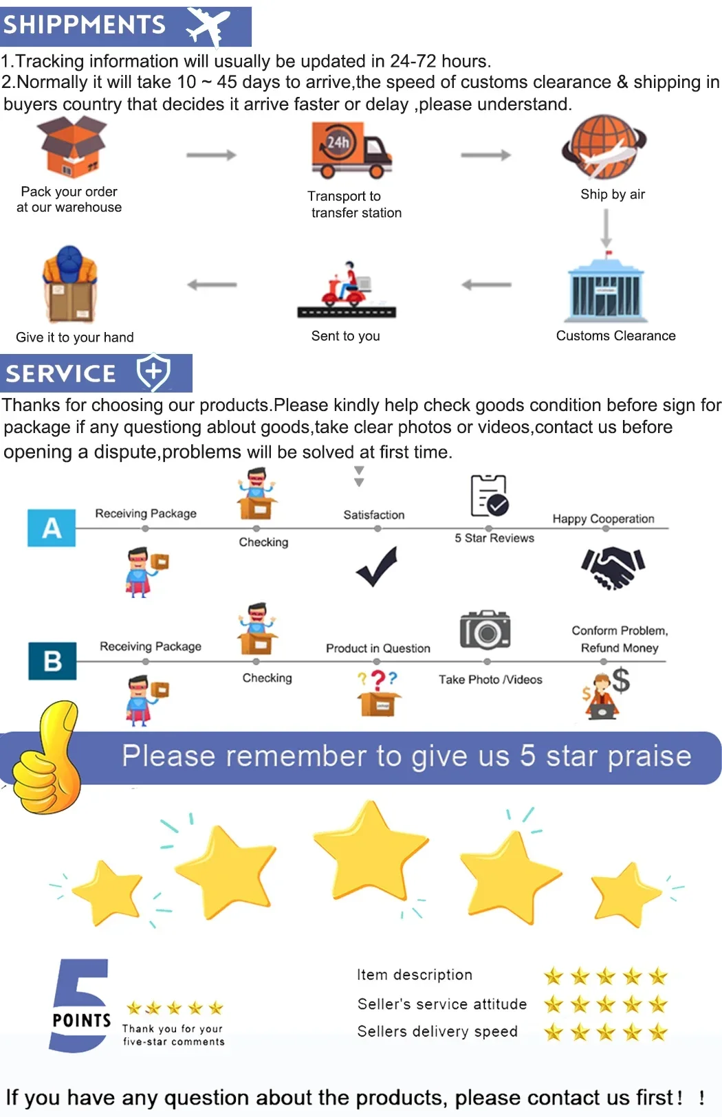• If you did not receive the product within the guaranteed time( 45 days not including 2-5 day processing) you can request a refund or a reshipment.