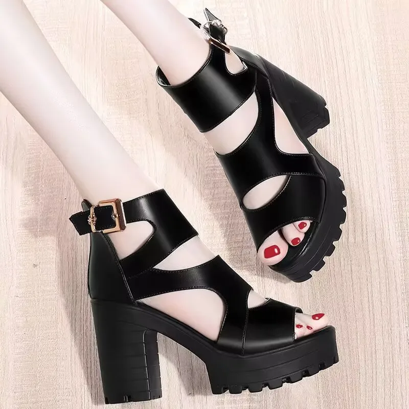 High heel sandals women’s summer new block heel buckle casual fish mouth breathable hollow heel women’s shoes