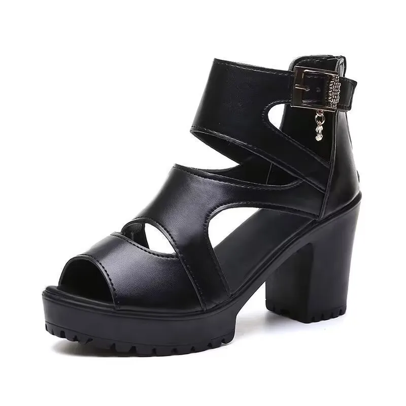 High heel sandals women’s summer new block heel buckle casual fish mouth breathable hollow heel women’s shoes