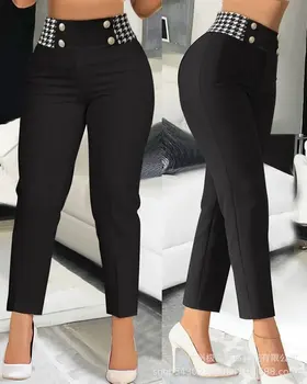 Houndstooth Print High Waist Work Pants Women Plaid Summer Spring Fashion Ankle Length Pants Office Lady