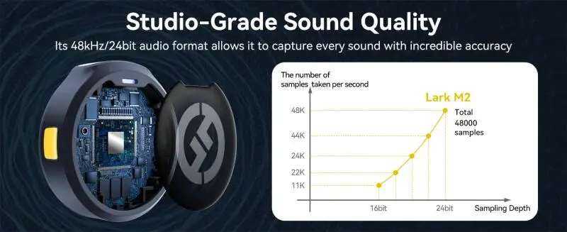 Designed for the Pro, LARK M2 microphone features a 48kHz/24bit audio format, capturing every sound with accuracy. With a 70dB signal-to-noise ratio, it ensures excellent audio signals with minimal background noise. Moreover, it can handle a Maximum 115dB Sound Pressure Level, perfect for recording in environments with high-pitched sounds.
