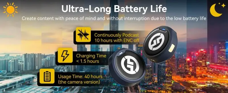 With optimized power efficiency, the LARK M2 wireless microphone can work for up to 10 hours (with ENC off). The compact charging case can fully charge the entire set twice, and each charge takes less than 2 hours. With the charging case, the camera version has a battery life of 40 hours. No more worrying about low battery situation.