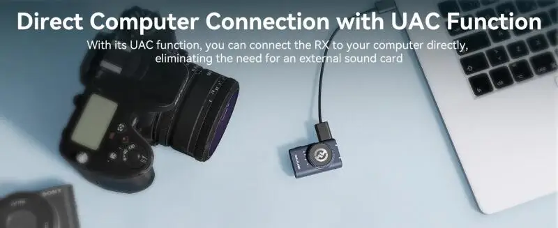 LARK M2 is equipped with a superior high-gain LDS antenna that eliminates interference caused by the human body, providing a stable and uninterrupted audio transmission of up to 1000ft/300m LOS range. With its UAC function, you can connect the RX to your computer directly, eliminating the need for an external sound card.