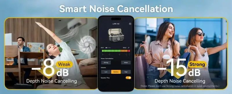 LARK M2 supports one-click on the yellow button to turn on/off the noise cancellation on the transmitter. On the receiver of the camera version, the indicator lights at the top of the RX will stay green when noise cancellation is on. Enhanced firmware and audio algorithms ensure crystal-clear, rich, and undistorted human voices, even in noisy environments.