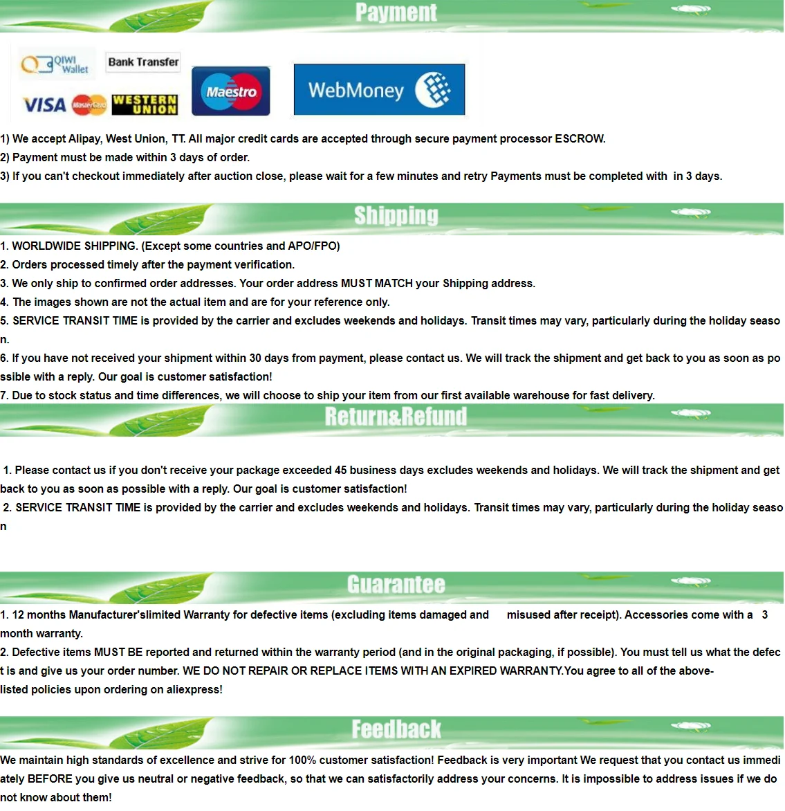 • If you did not receive the product within the guaranteed time( 45 days not including 2-5 day processing) you can request a refund or a reshipment.