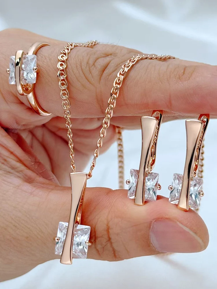 Kienl Square White Natural Zircon Ring Earrings Necklace for Women 585 Rose Gold Color Wedding Accessories Daily Fine Jewelry