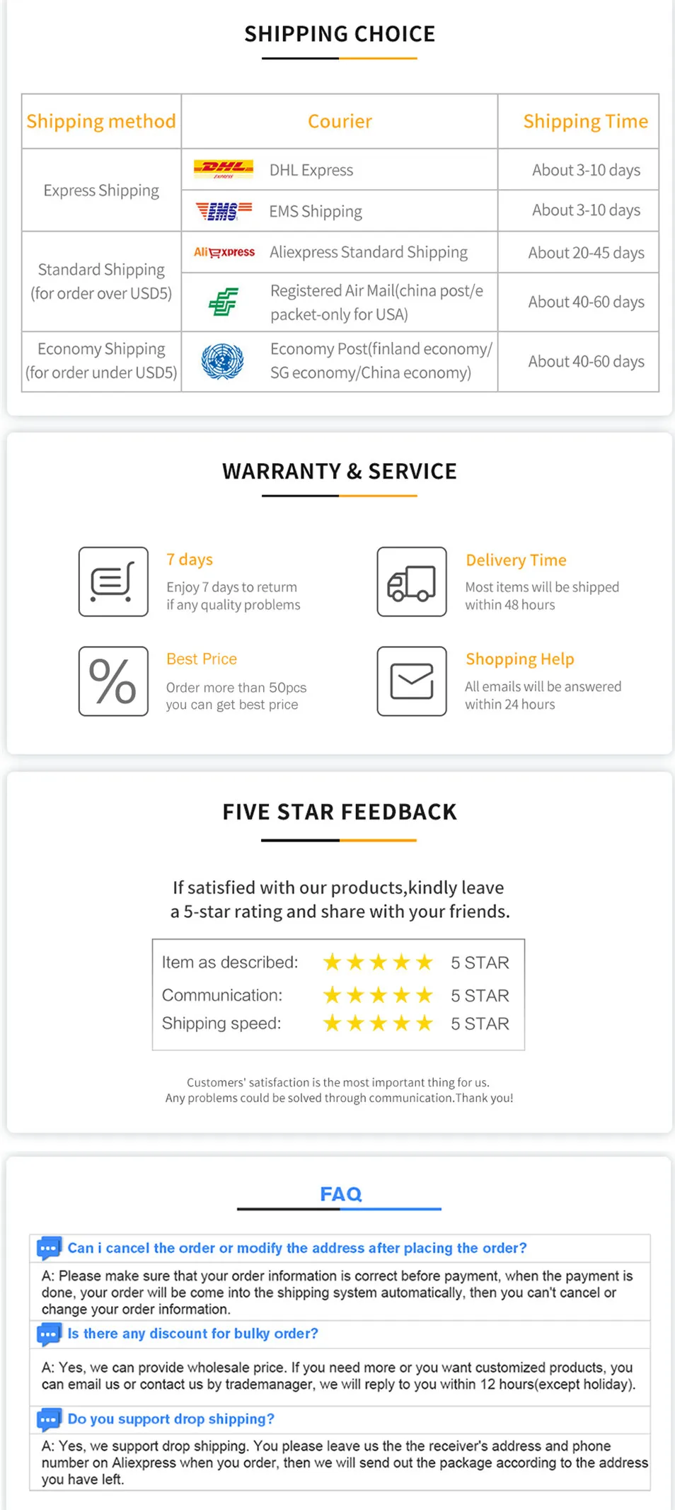 • If you did not receive the product within the guaranteed time( 45 days not including 2-5 day processing) you can request a refund or a reshipment.