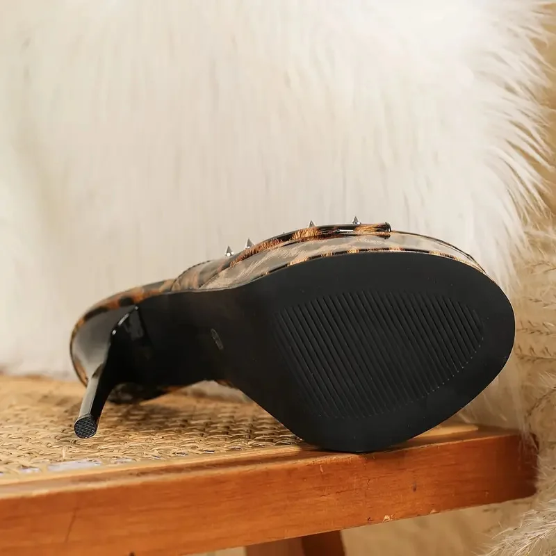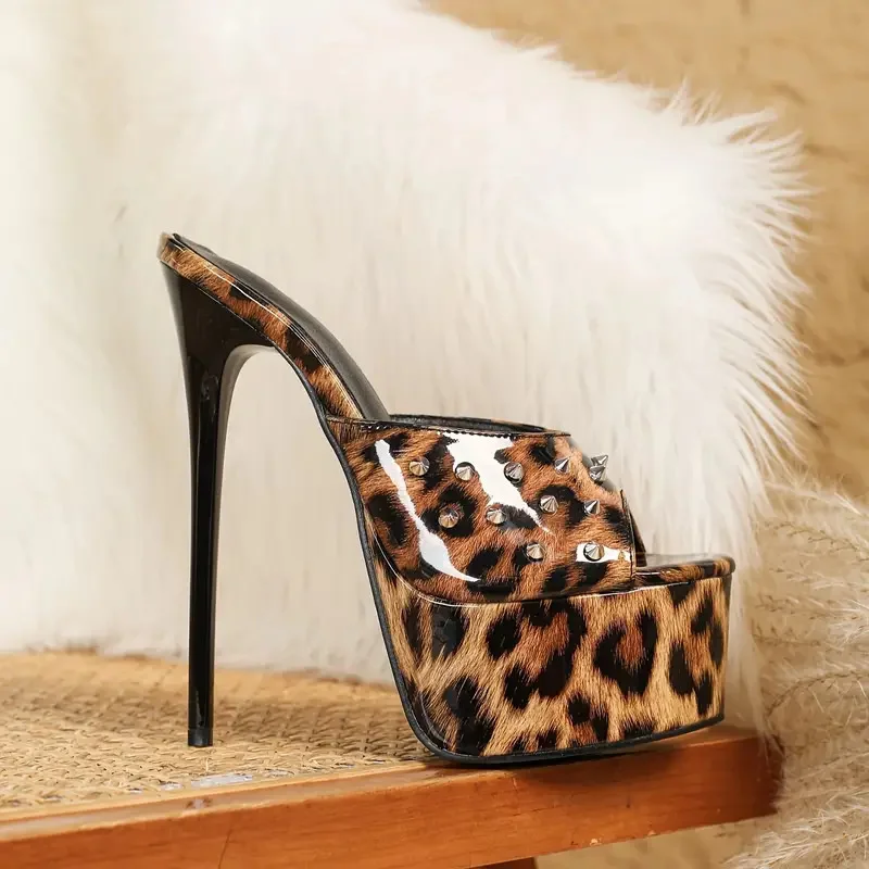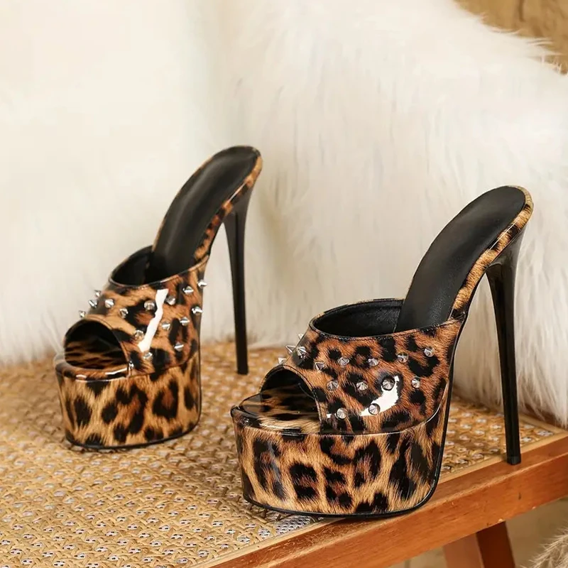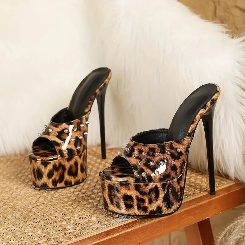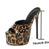 Liyke Summer 16CM Women’s Super High Heels Modern Slippers Sexy Rivet Leopard Print Platform Sandals Female Party Stripper Shoes