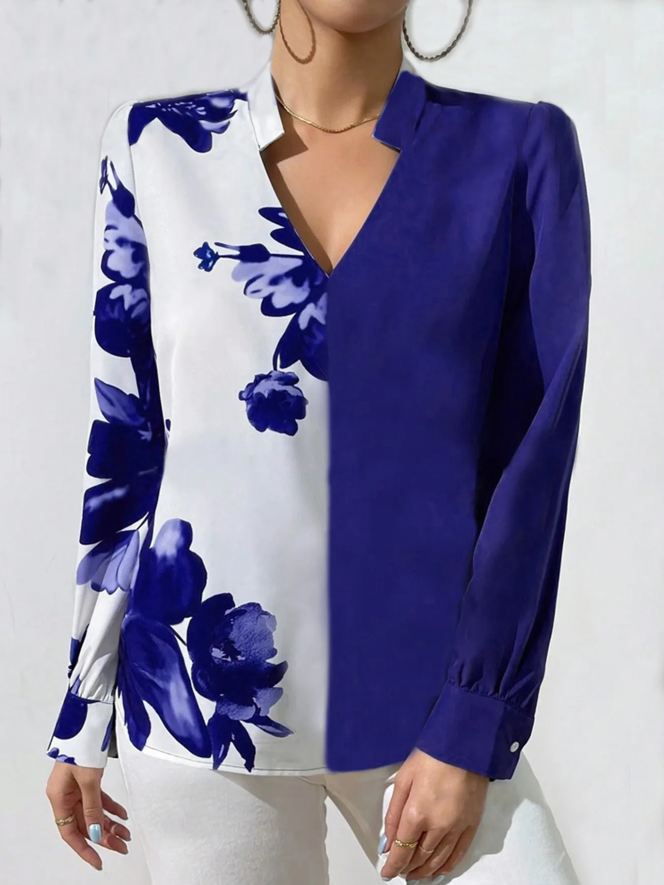 Long Sleeve Blue Flower Print Blouse Women 2024 Spring And Autumn Ladies Tops Elegant Work Office Casual Shirt Blouse