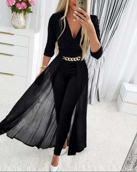 Fall Outfits Women Chain Decor Sheer Mesh Overlay Long Sleeve Tight Fitting Jumpsuit Fashion and Elegant Commuting Combinations