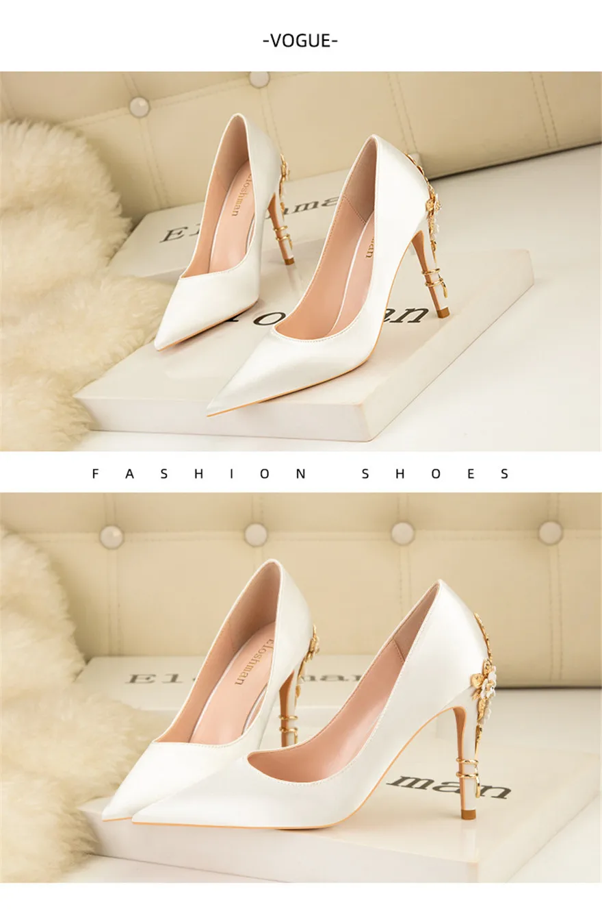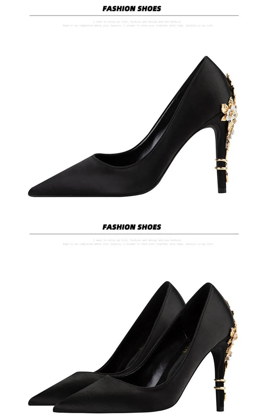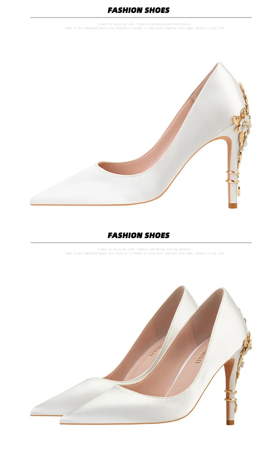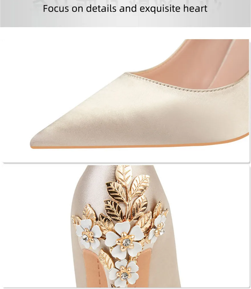 Luxury Metal Flowers Heel Crystal Bridal Shoes For Women Pointed Soft Silk Dress Shoe Shallow Sexy High Heels Pumps Female Party