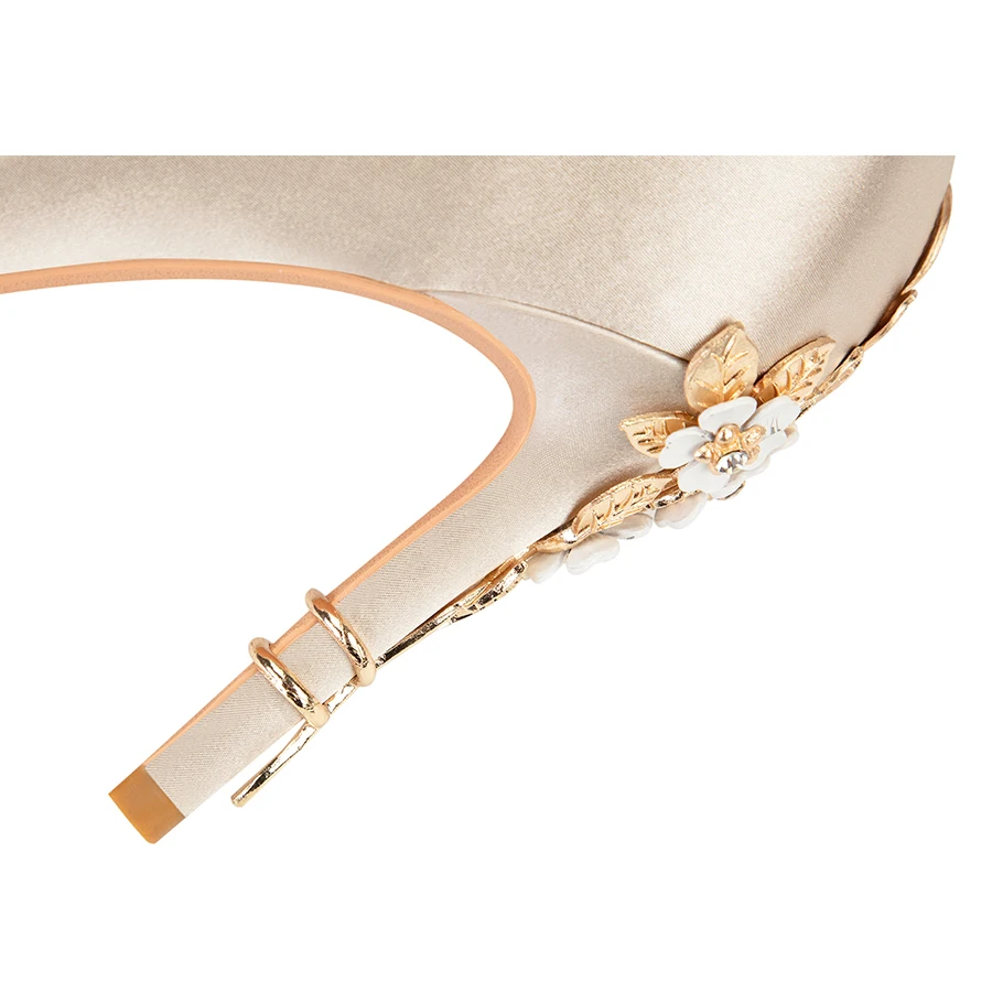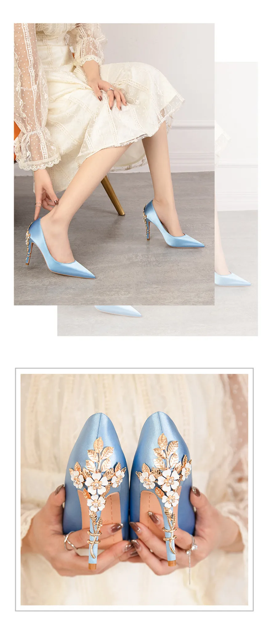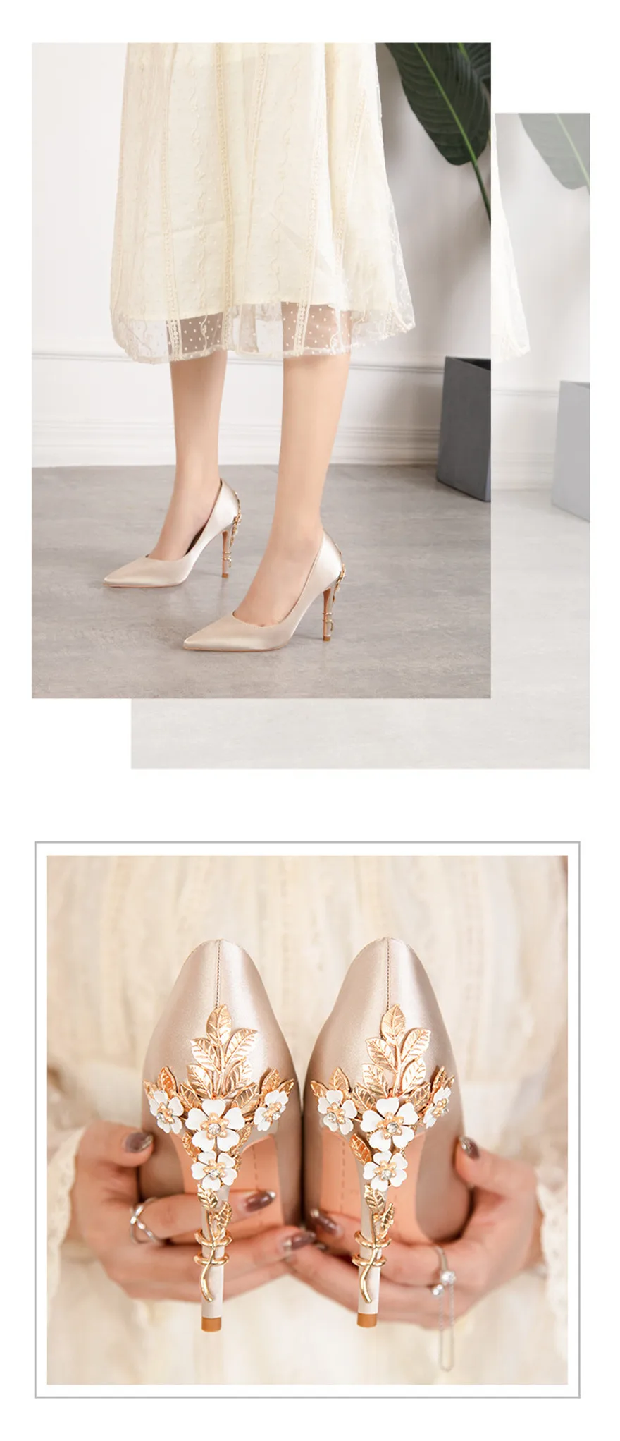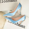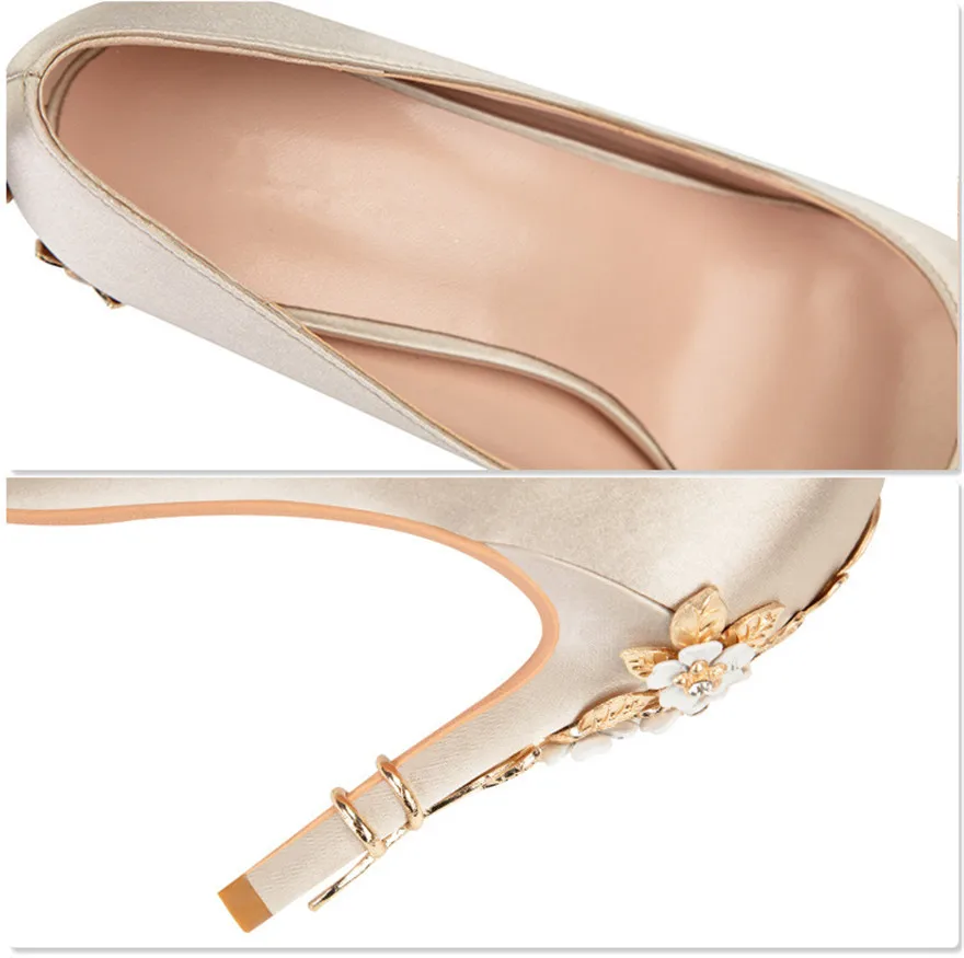 Luxury Metal Flowers Heel Crystal Bridal Shoes For Women Pointed Soft Silk Dress Shoe Shallow Sexy High Heels Pumps Female Party