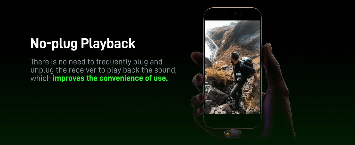 The receiver features a built-in usb-c port, eliminating the need for additional splitter cables.With the ability to charge your phone while recording, you can stream and communicate without worrying about running out of battery.
