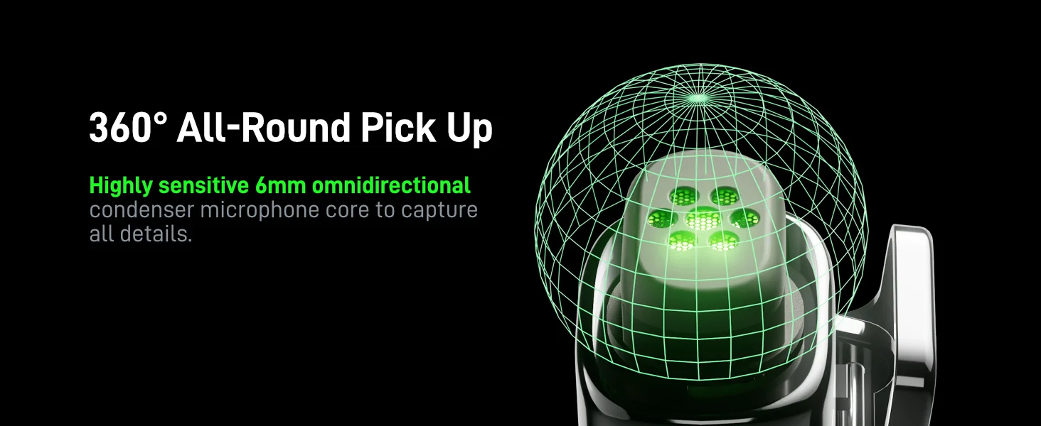 Equipped with a premium 6mm condenser mic, it delivers full omnidirectional recording, ensuring every detail is captured from all angles. Perfect for immersive audio experiences, no matter where the sound originates.