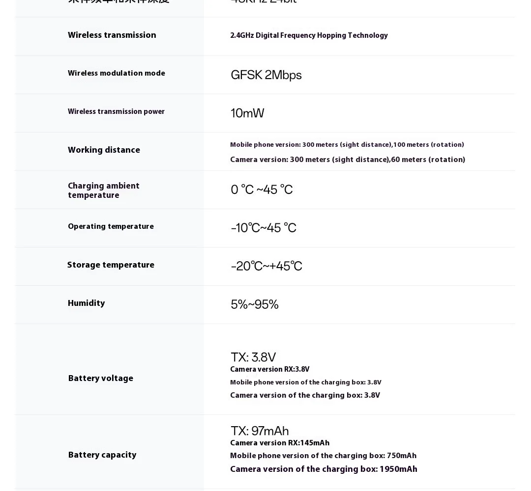 Camera version charging case: simultaneously charge 2 TX and 1 camera version RX more than 3 times