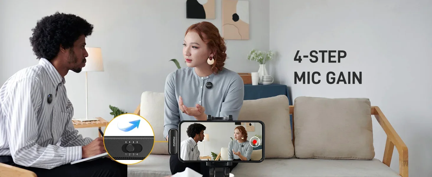 With a sampling rate of 16Bit/48kHz, WM620 wireless lavalier microphone captures audio precisely and preserves the subtleties and dynamics of your voice. The receiver is equipped with a 4-level gain slider switch, allowing you to easily adjust the volume of your phone recordings. Say goodbye to concerns about fixed gain interfering with your sound levels. With impeccable sound quality, your videos will stand out and attract more fans and likes!