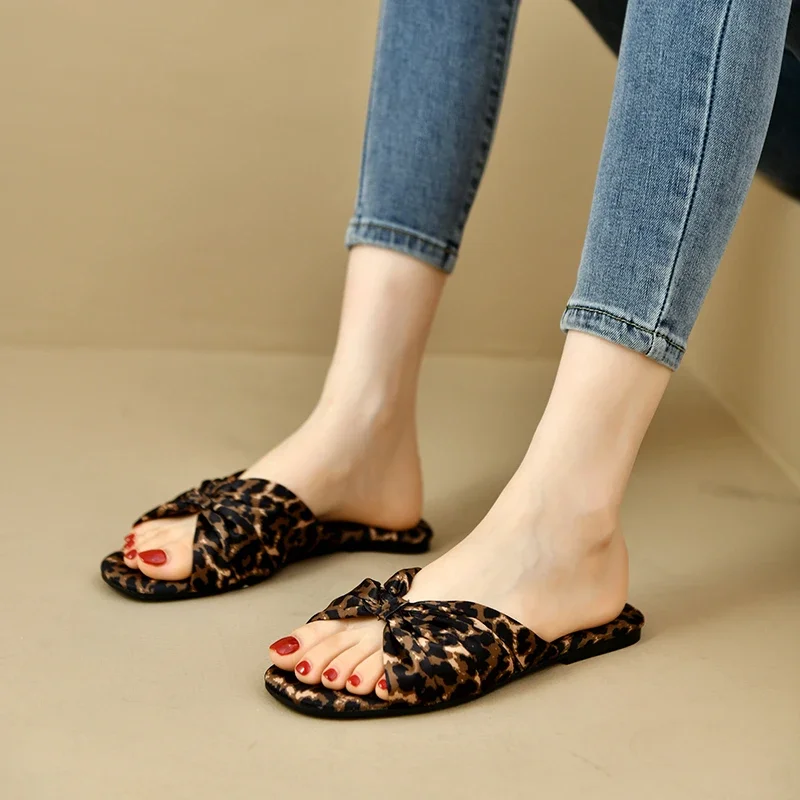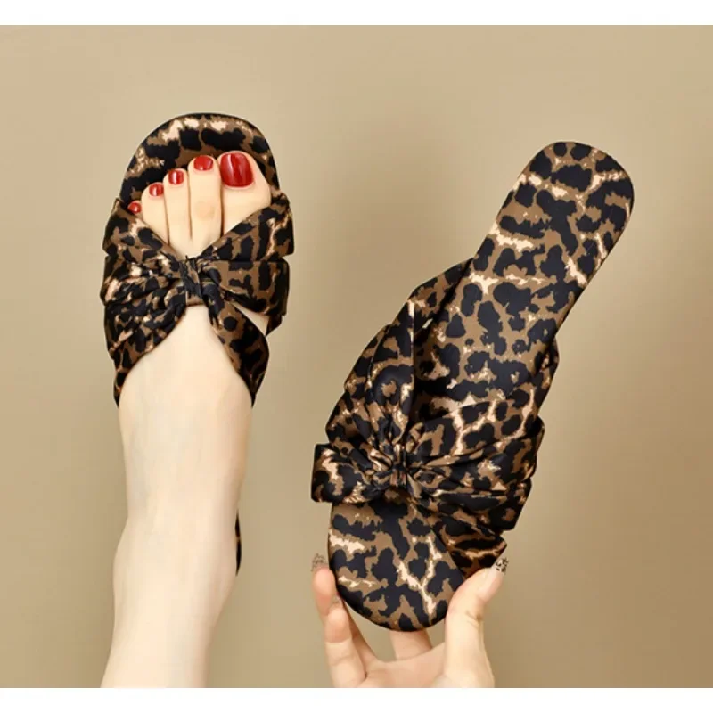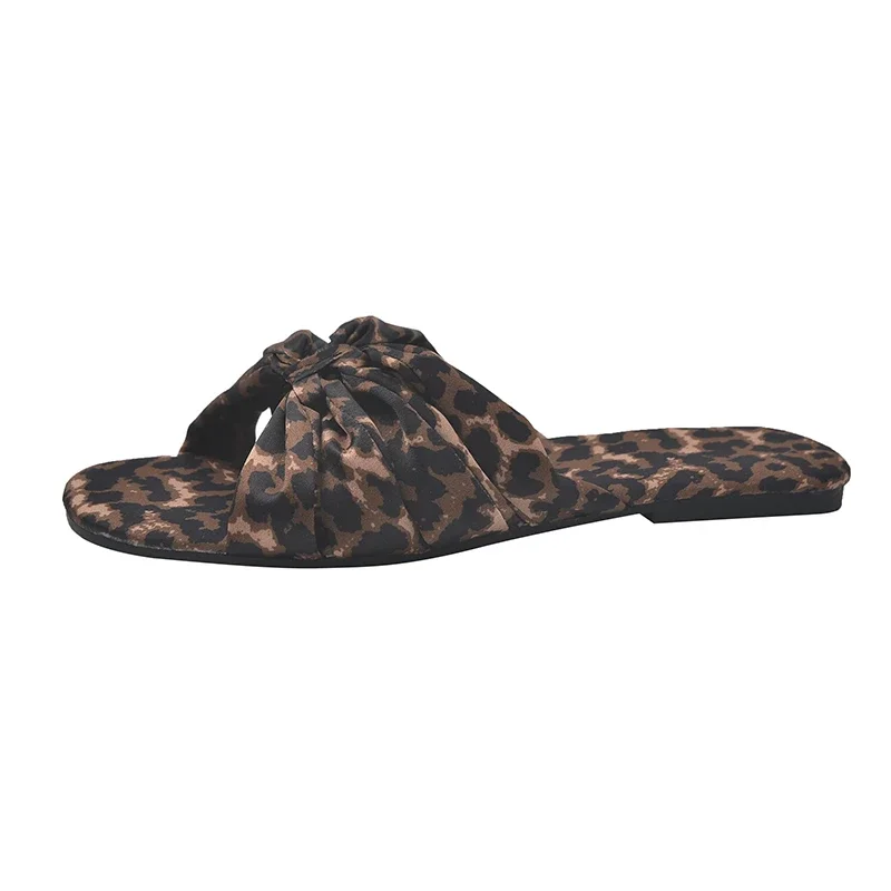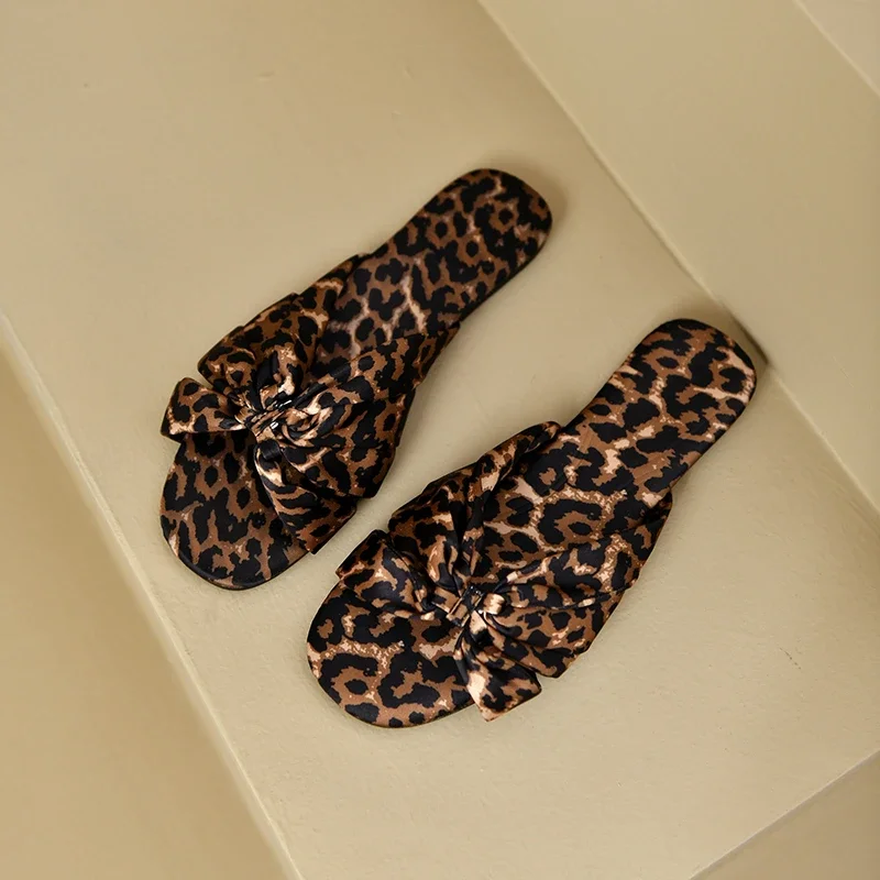 New European and American Women Shoes Bow Knot Leopard Print Casual Flat Slippers Beach Sandals Ladies Slippers Zapatos Mujer