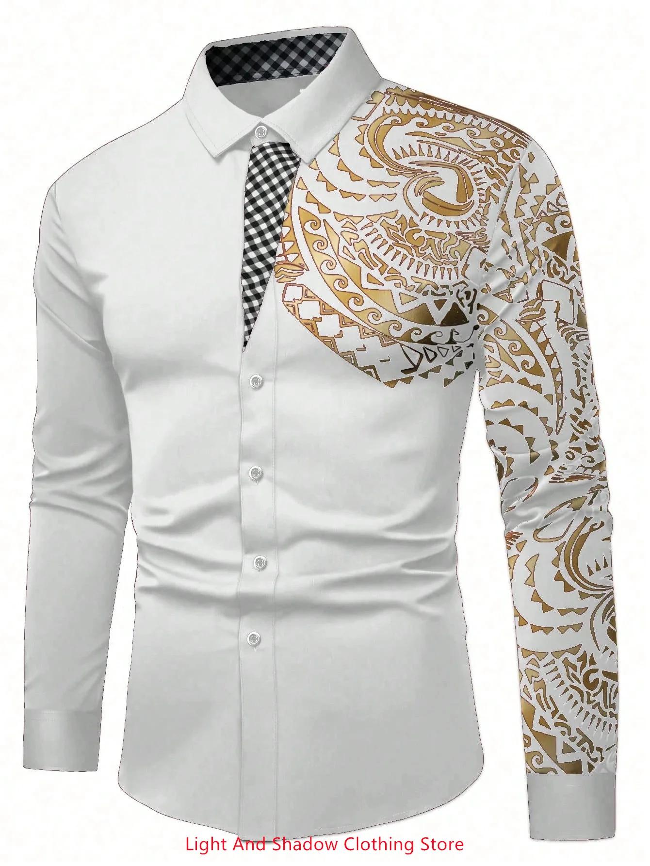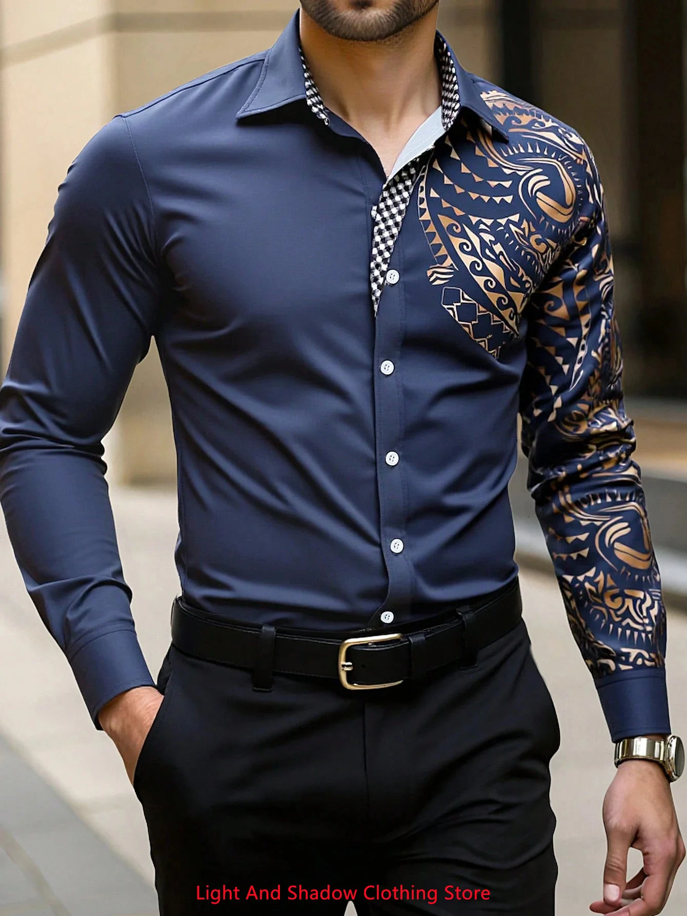 New men’s fashionable business casual long sleeved shirt, classic printed collar, social party comfortable men’s clothing