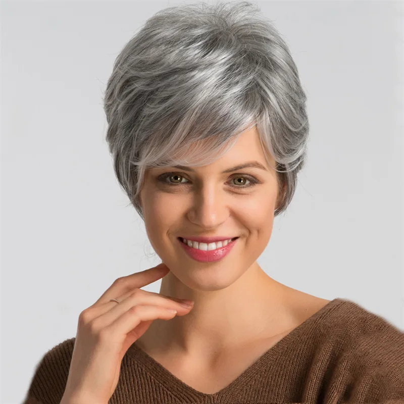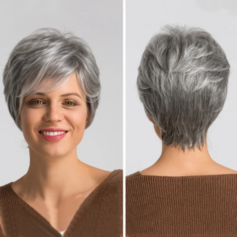 New wig female grandma grey fashion short curly hair for the elderly woven synthetic fiber high temperature silk head cover