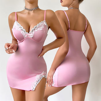 Summer hot Women Nightdress Seductive Pink Deep V Sleeveless Fashion Lace Sleep Pajamas Dress Ladies Lingerie Nightgown Homewear