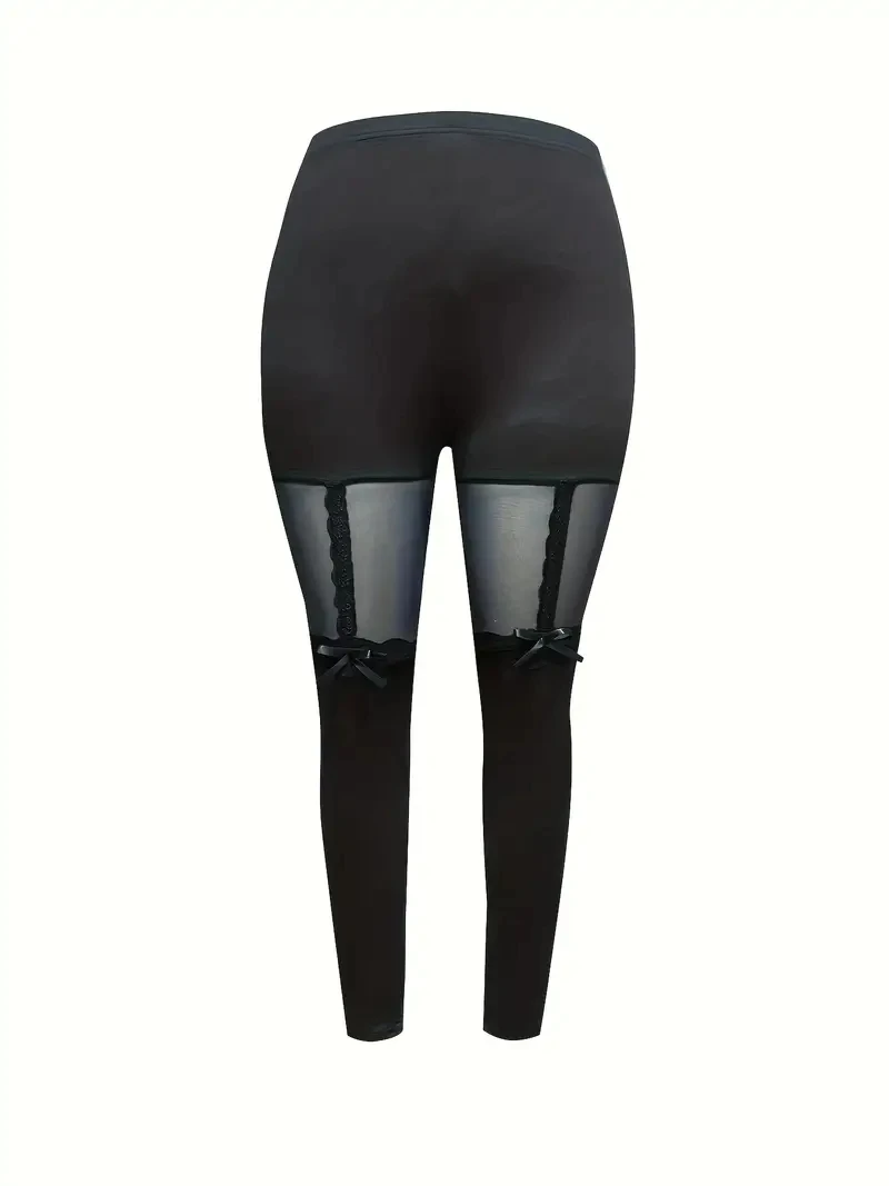 Plus-size lace mesh paneled leggings with a bow decoration on the high-waisted tight pants for women.